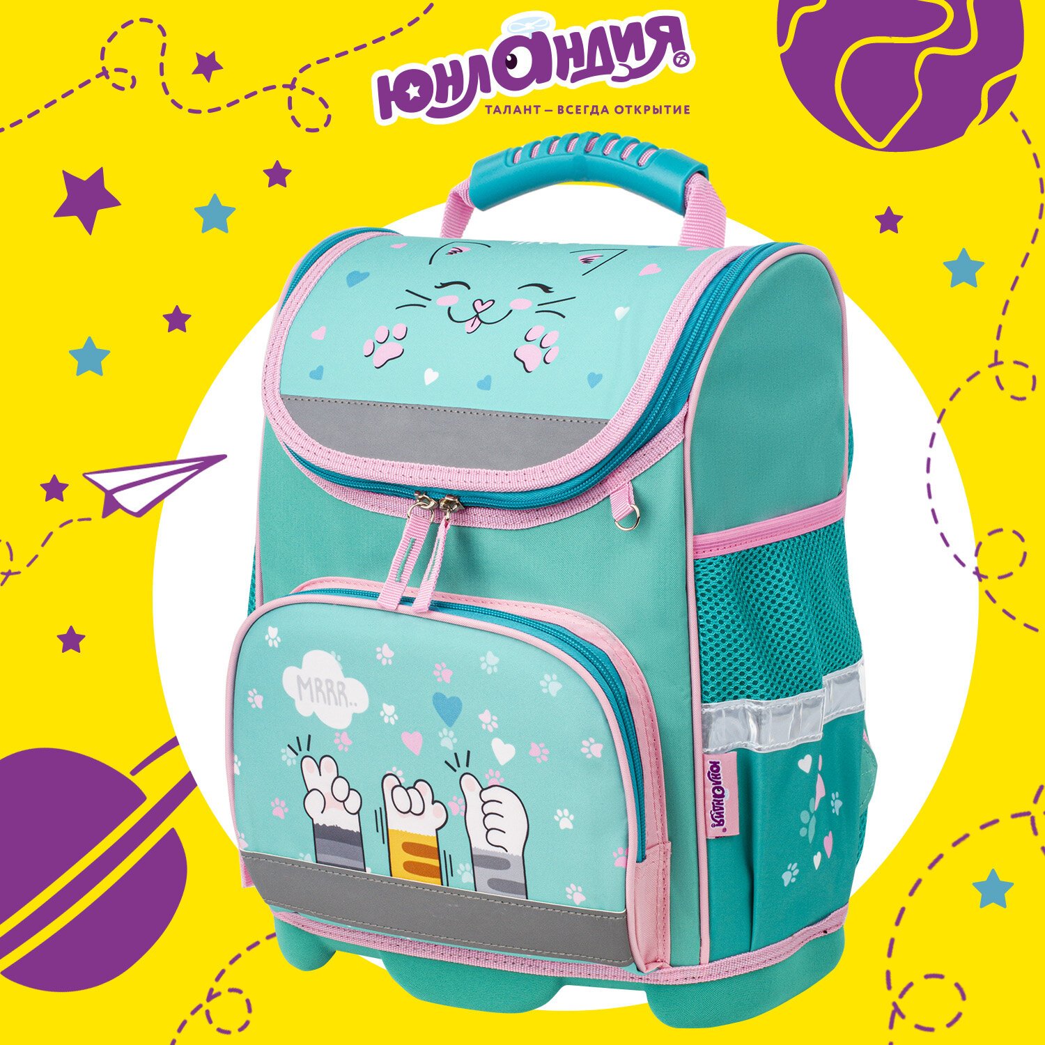 Ранец ЮНЛАНДИЯ WISE, 1 отделение, 3 кармана, устойчивое дно, "Soft paws", 37х29х15 см, 229946