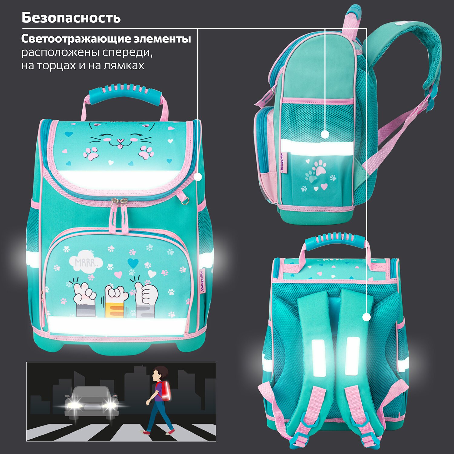 Оптимальный размер ранца, мягкие регулируемые по длине лямки и вес 850 грамм полностью удовлетворяют потребности ученика начальной школы. Светоотражающие элементы со всех сторон ранца обеспечивают безопасность на дороге в темное время суток.