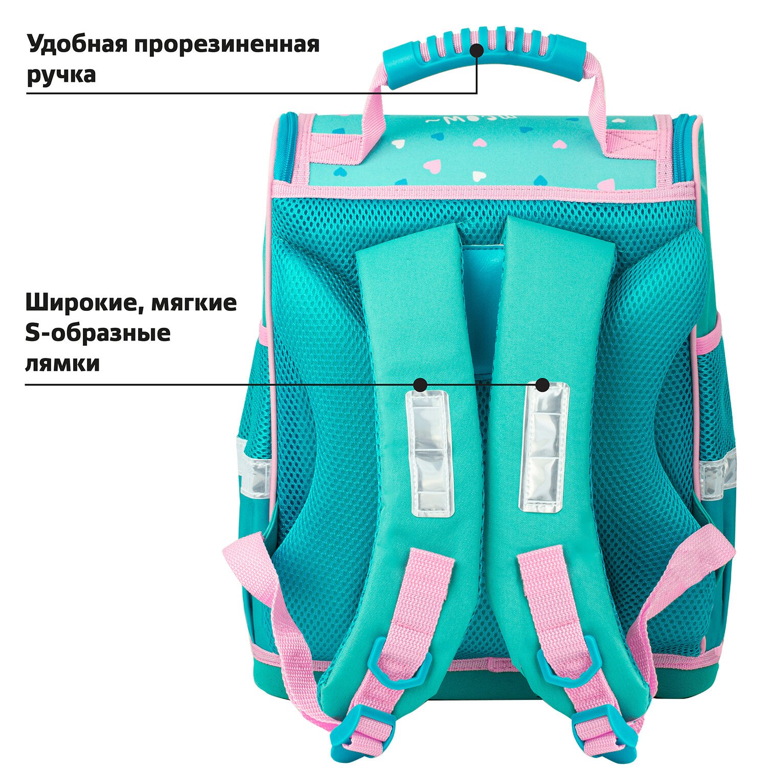 Яркая этикетка расположена на ручке ранца, делая его более заметным на полке магазина, а информация в ней отражает главные потребительские свойства, помогая покупателю принять решение о покупке.
