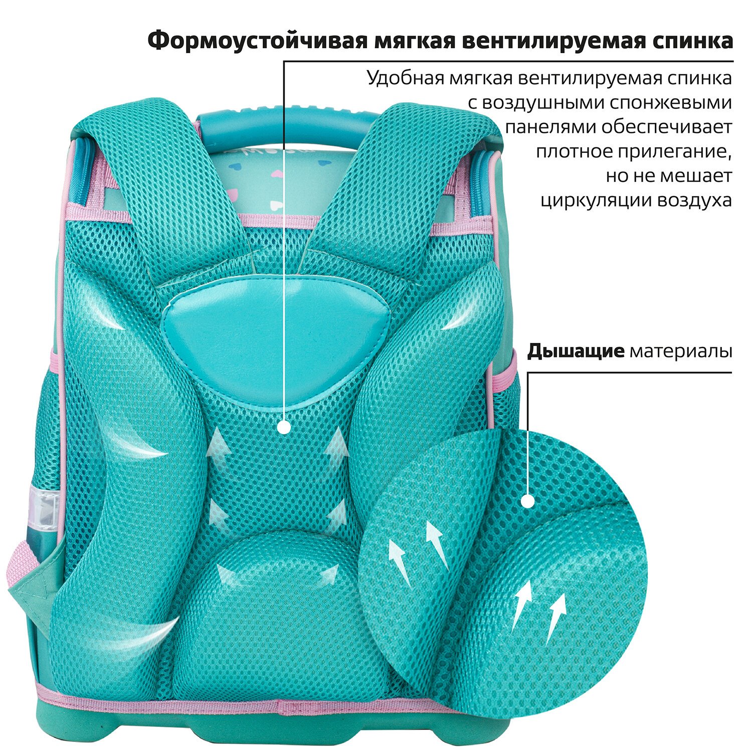 Специальная форма спинки с анатомическими спонжевыми панелями способствует равномерному распределению нагрузки на спину и формированию правильной осанки.