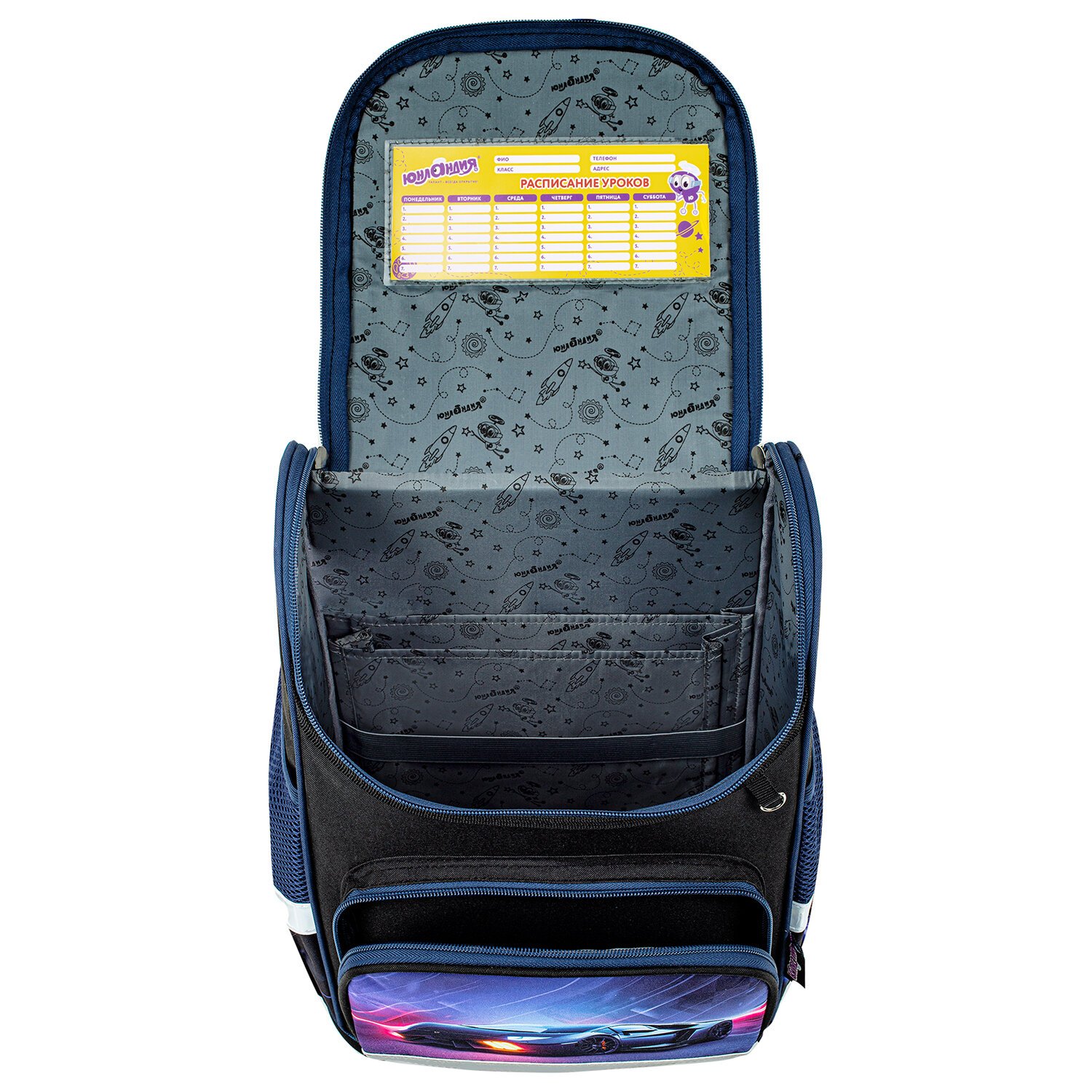Внутренние разделители для книг и тетрадей в основном отделении позволяют правильно организовать пространство в ранце. Еще одна удобная опция – вкладыш для заполнения расписания уроков и контактной информации школьника на внутренней стенке крышки ранца.