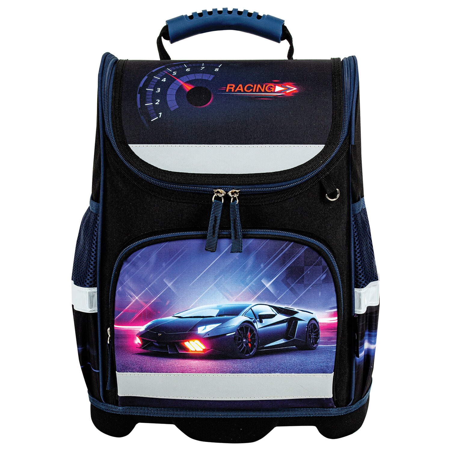 Жесткокаркасный ранец выполнен из прочного, износостойкого полиэстера. Ранец состоит из одного просторного отделения, одного переднего и двух боковых карманов.
