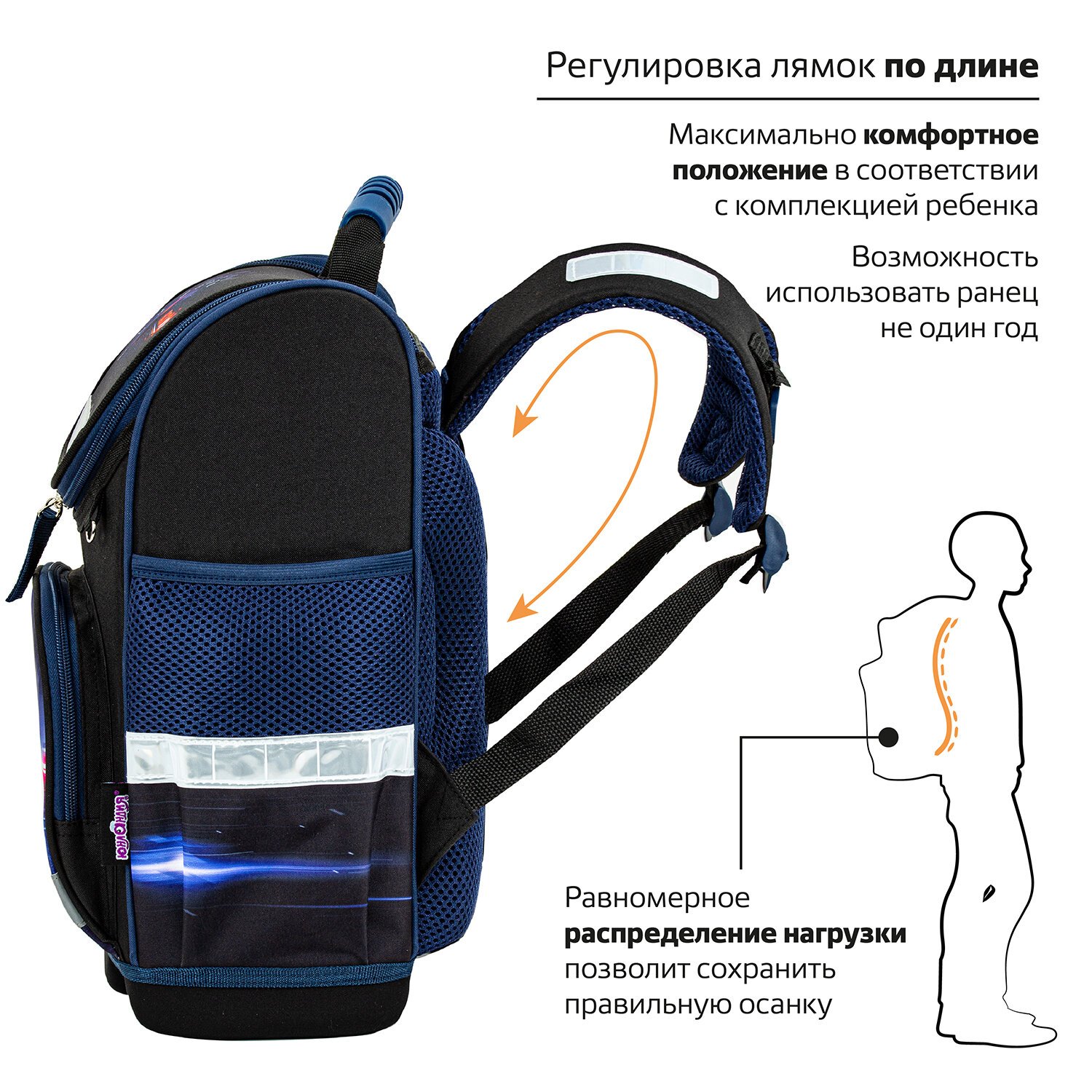 Специальная форма спинки с анатомическими спонжевыми панелями способствует равномерному распределению нагрузки на спину и формированию правильной осанки.