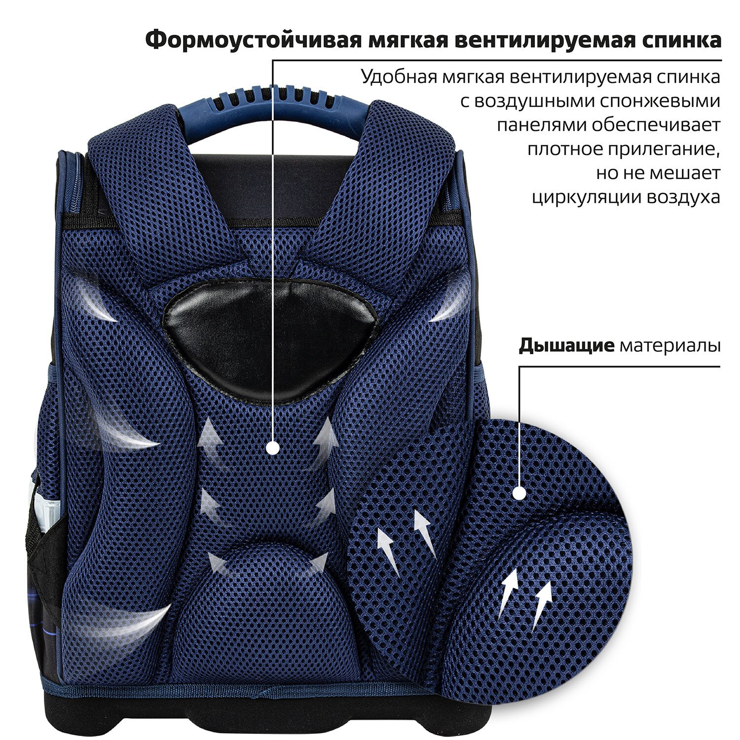 Уплотненное рельефное дно из эргономичного материала EVA сохраняет устойчивость, жесткость и функциональность ранца, при этом не утяжеляя его. Рельефная структура материала позволяет сохранить устойчивость даже на неровной поверхности.