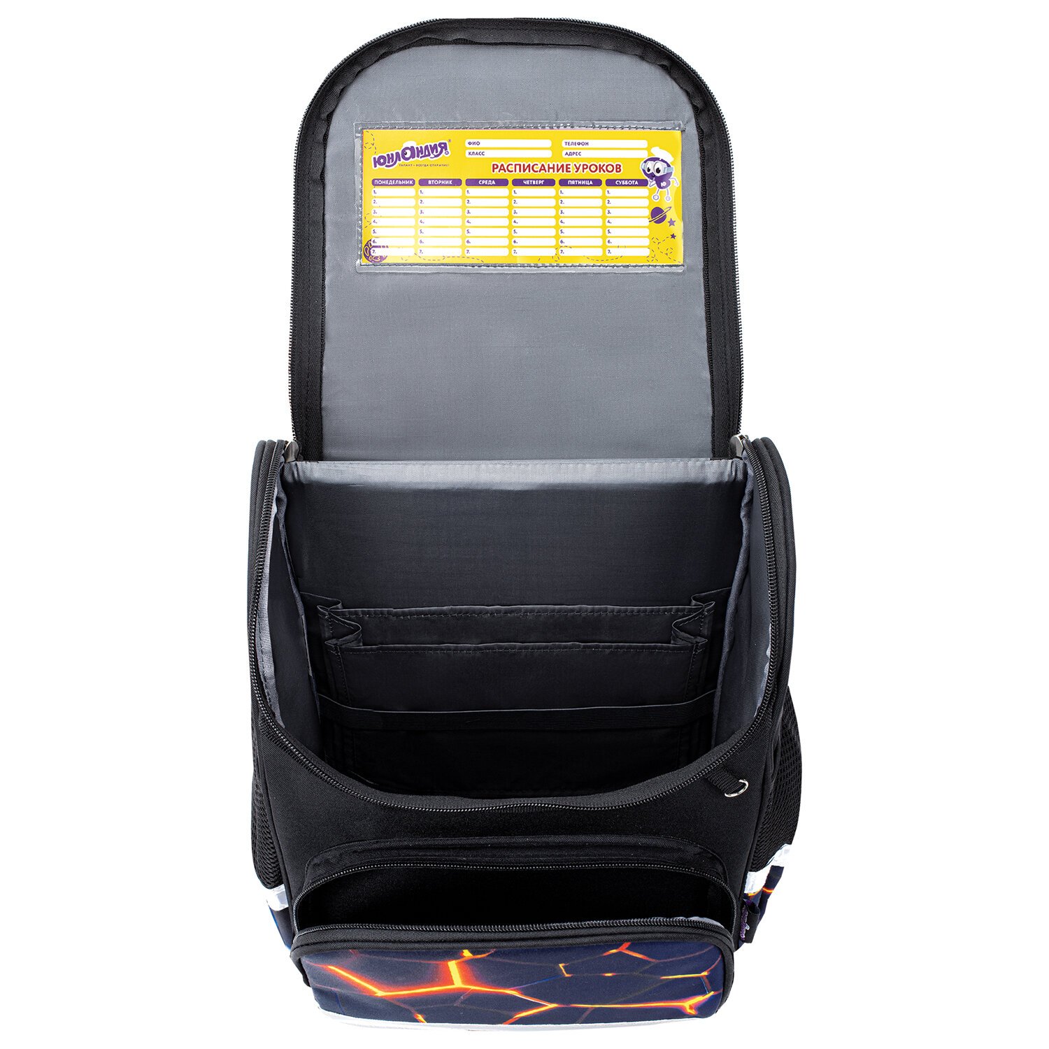 Внутренние разделители для книг и тетрадей в основном отделении позволяют правильно организовать пространство в ранце. Еще одна удобная опция – вкладыш для заполнения расписания уроков и контактной информации школьника на внутренней стенке крышки ранца.