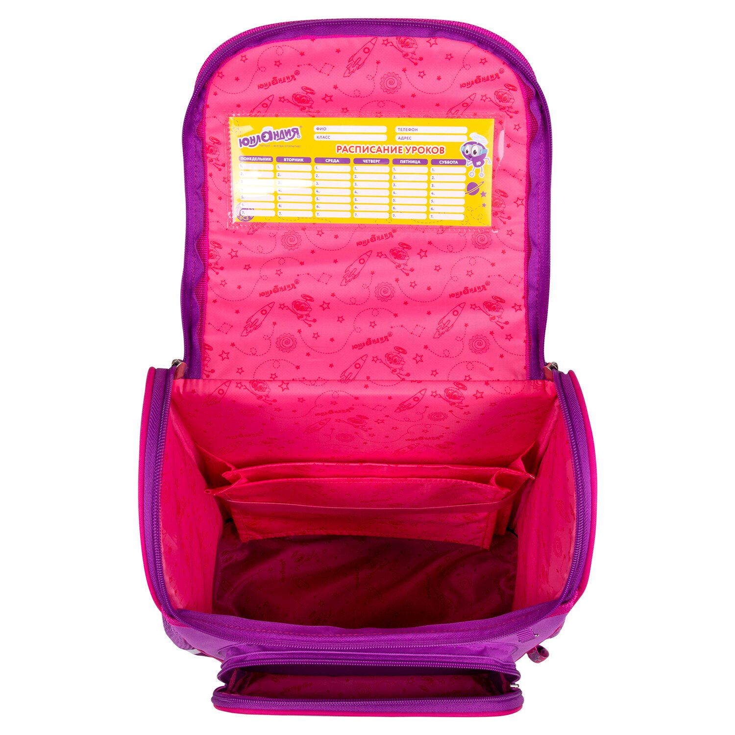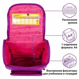 Внутренние разделители для книг и тетрадей в основном отделении позволяют правильно организовать пространство в ранце. Еще одна удобная опция – вкладыш для заполнения расписания уроков и контактной информации школьника на внутренней стенке крышки ранца.
