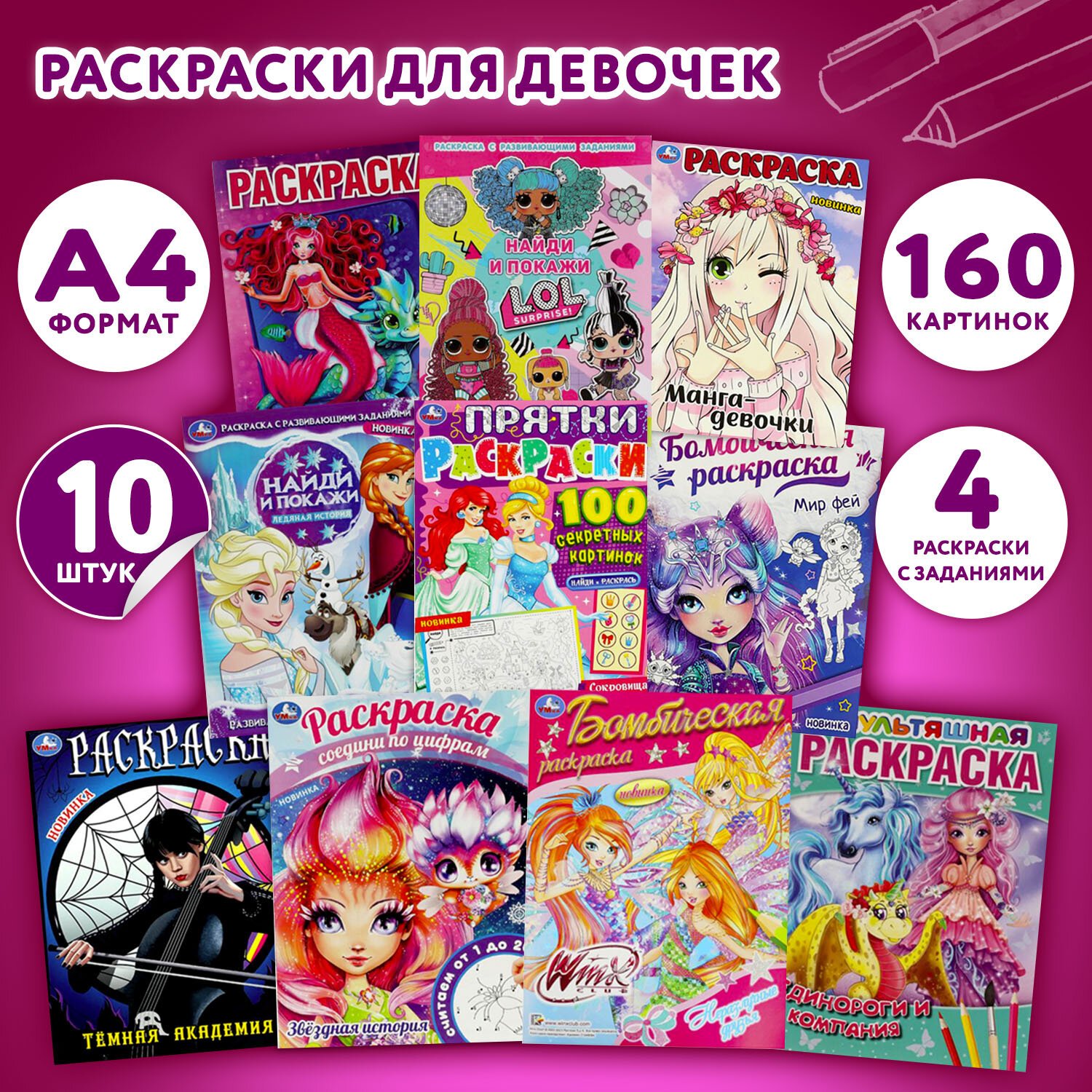 Раскраски "Для девочек", КОМПЛЕКТ 10 шт., А4, 214х290 мм, 16 стр., лицензия, УМКА