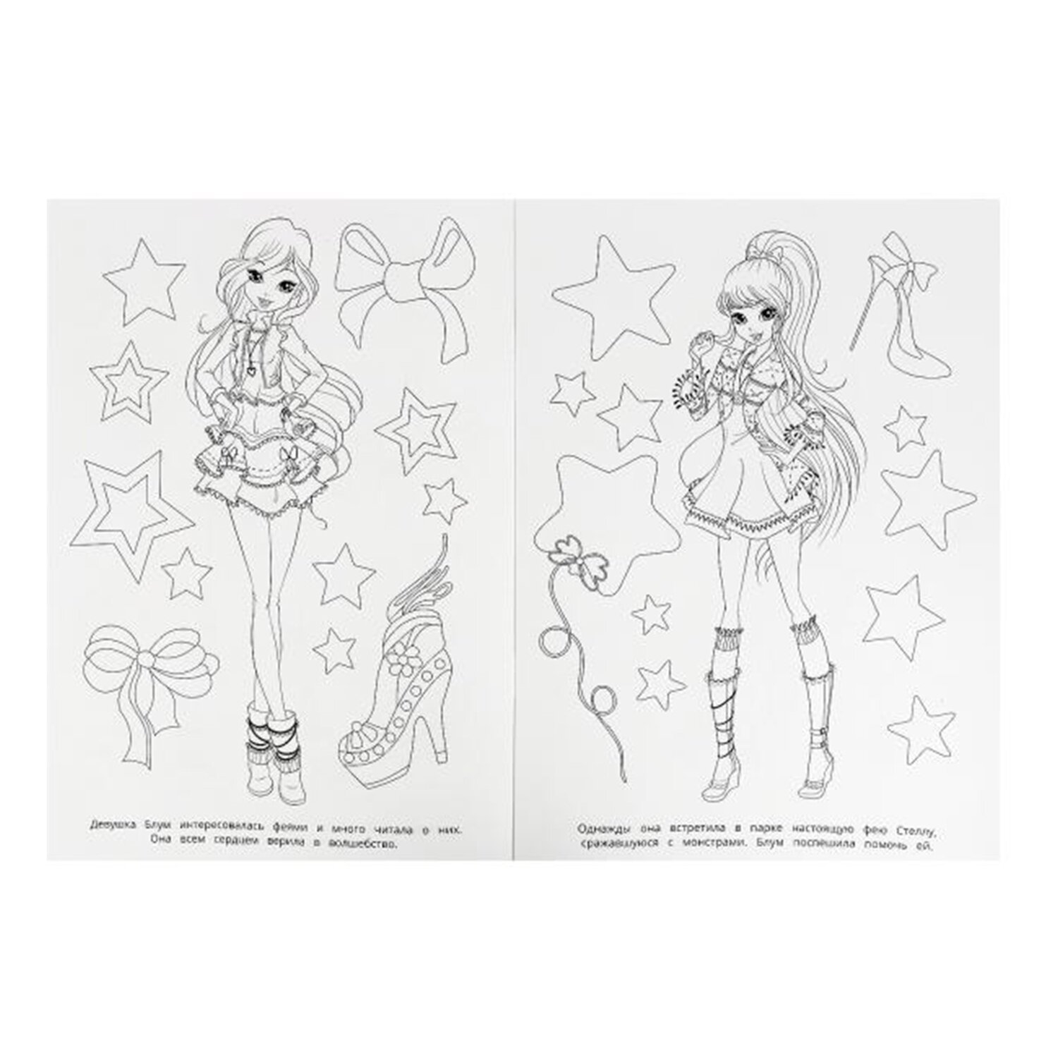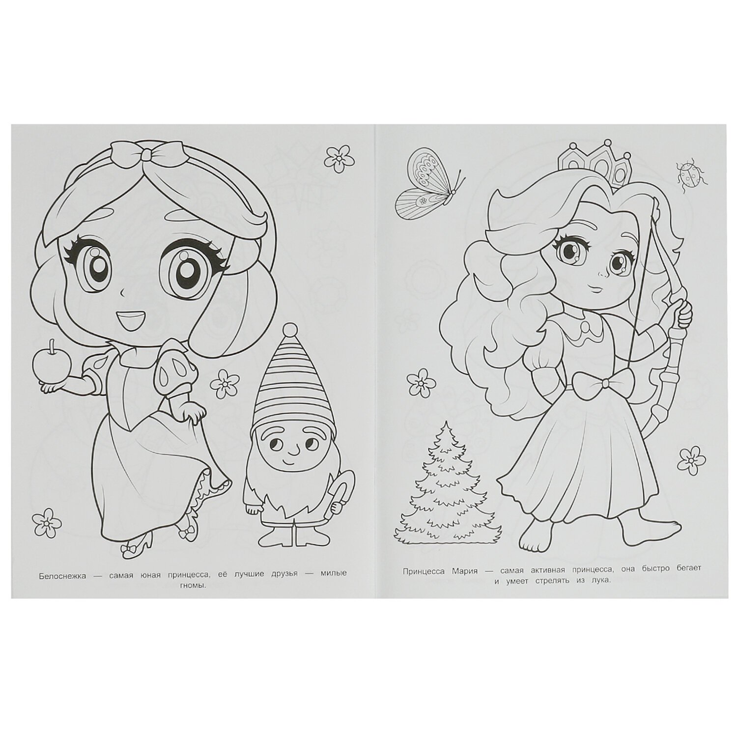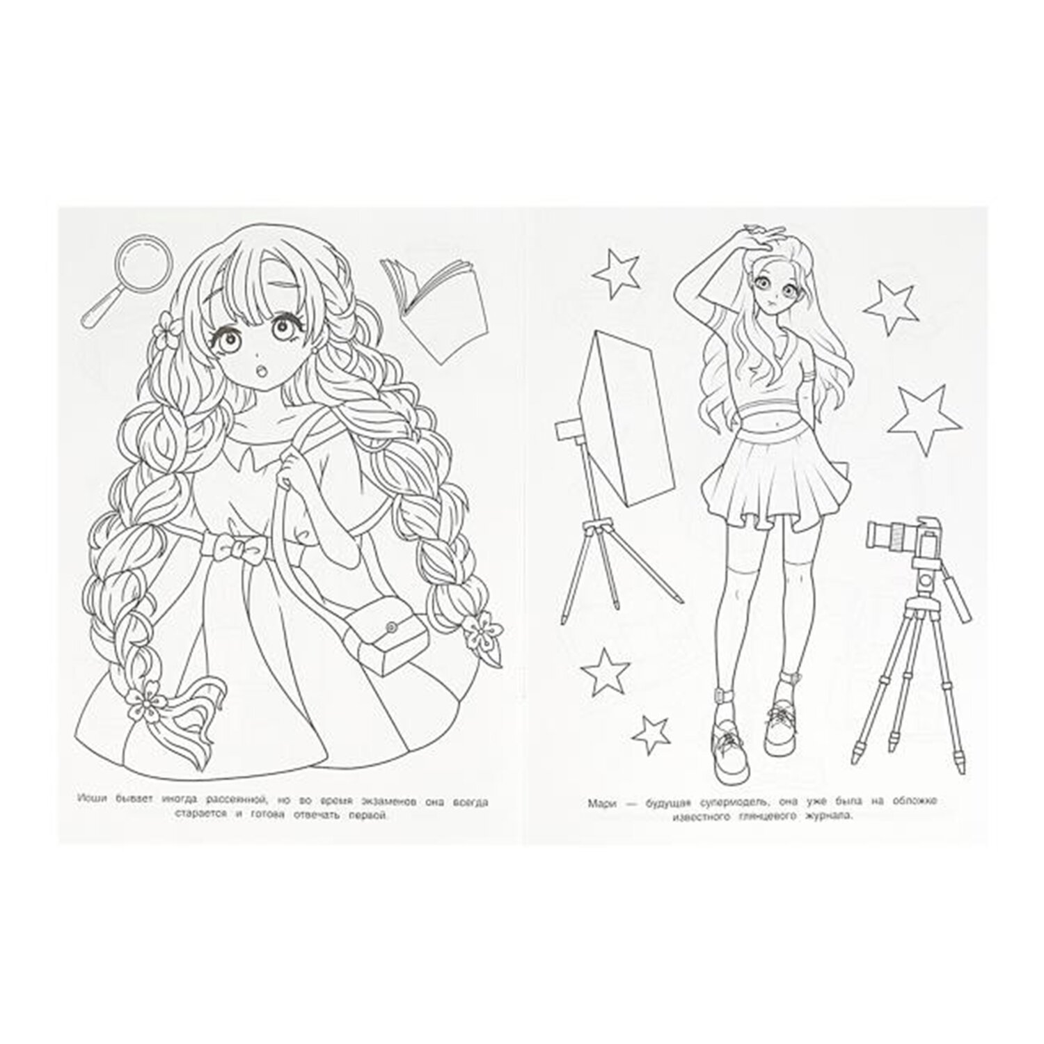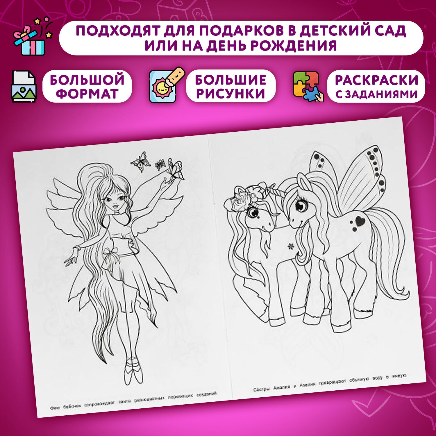 Комплект состоит из 10 раскрасок разных сюжетов без возможности выбора сюжетов. В наборе представлены самые популярные сюжеты для девочек 4-6 лет. В наборе есть раскраски с заданиями.