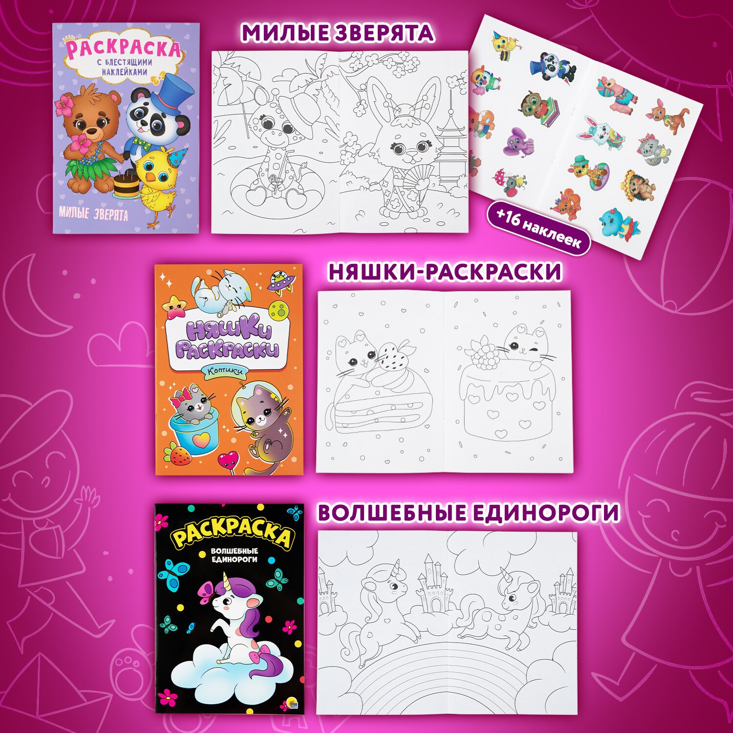 Комплект состоит из 7 раскрасок разных сюжетов с наклейками и без, а также 1 аппликация (вырезалка-наряжалка). Без возможности выбора сюжетов!
