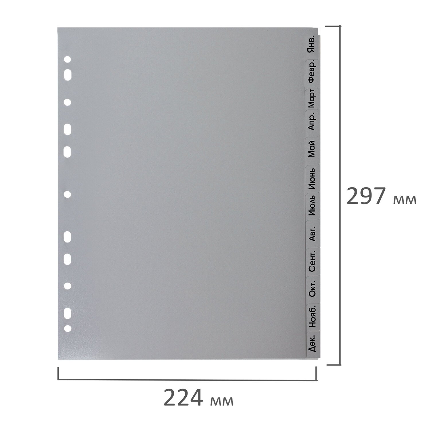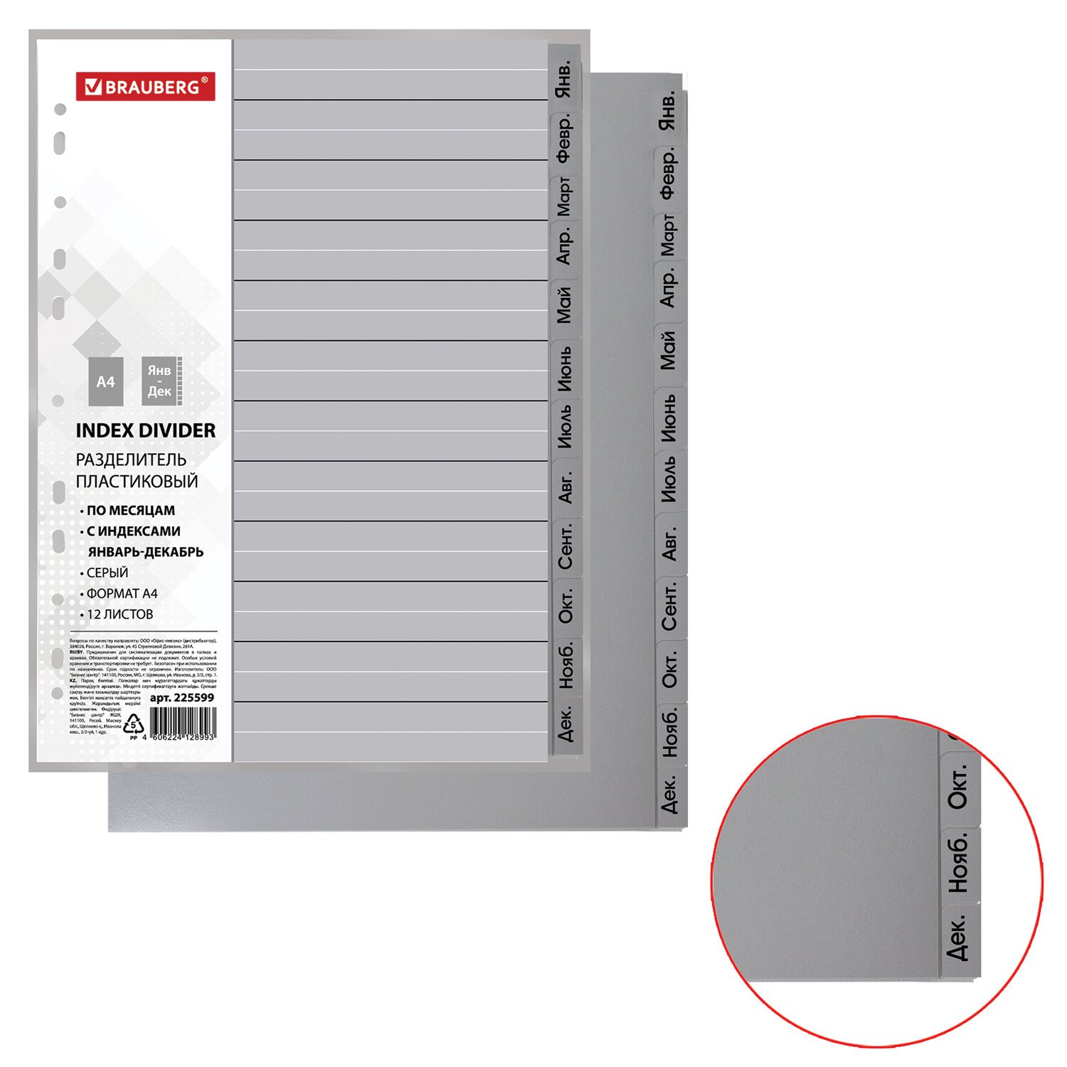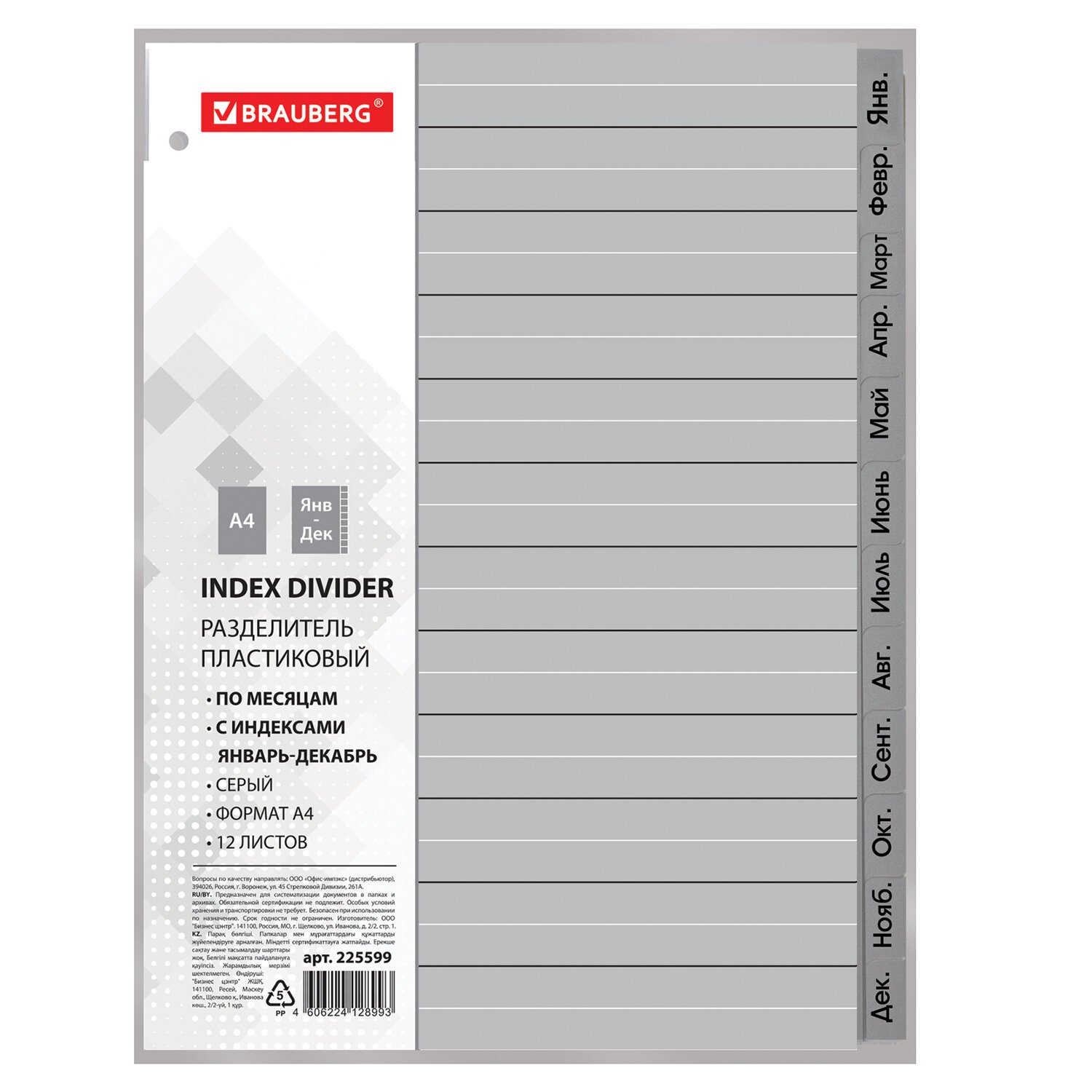 Разделитель пластиковый BRAUBERG, А4, 12 листов, Январь-Декабрь, оглавление, серый, РОССИЯ, 225599