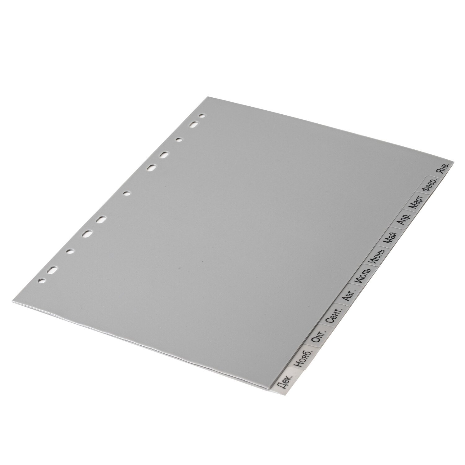 Изготовлены из пластика толщиной 0,12 мм. В комплект входят 12 листов серого цвета, обеспечивающих возможность сортировки документов по месяцам, а также титульный лист для оглавления. Универсальная перфорация позволяет подшивать разделители во все типы папок. Размер - 224х297 мм.