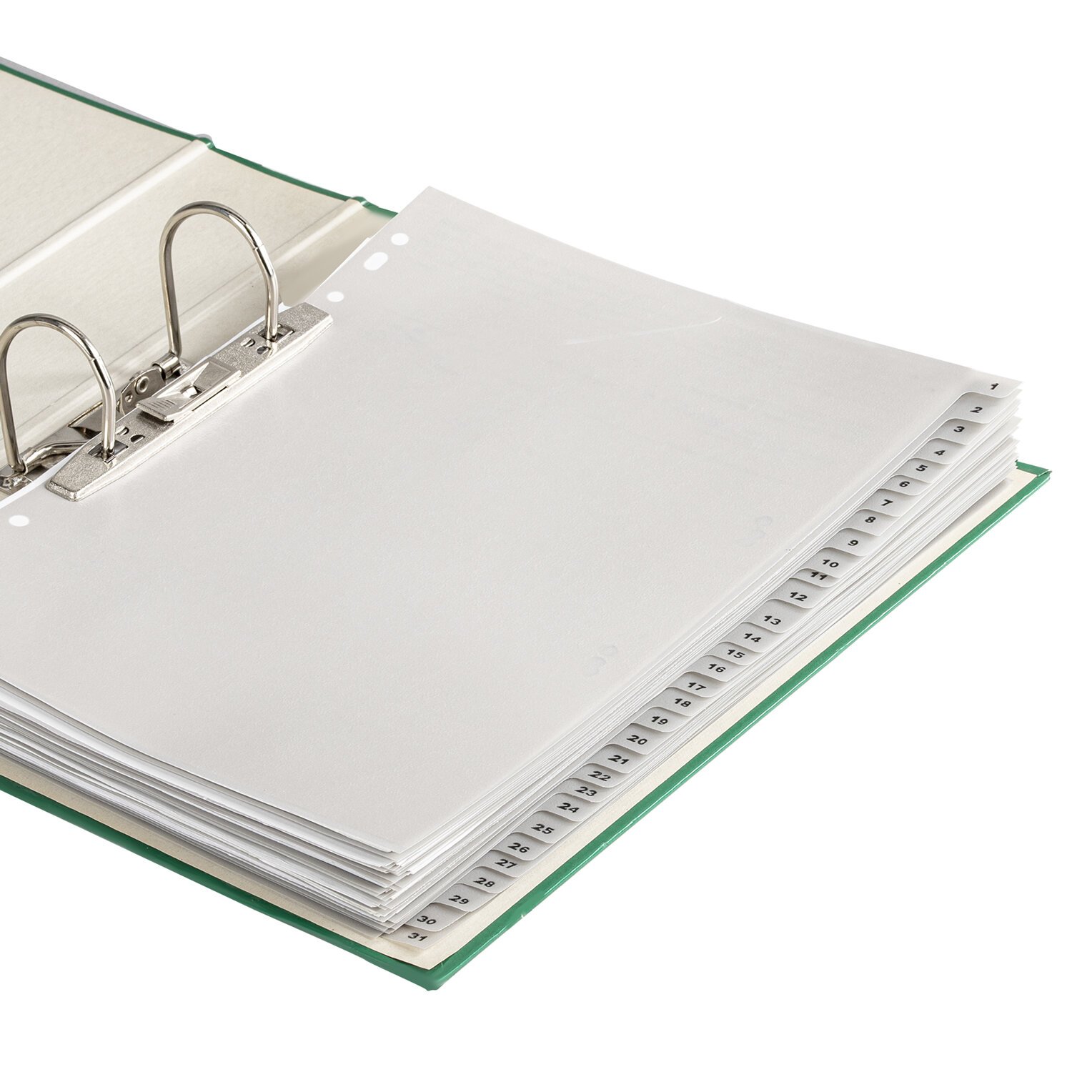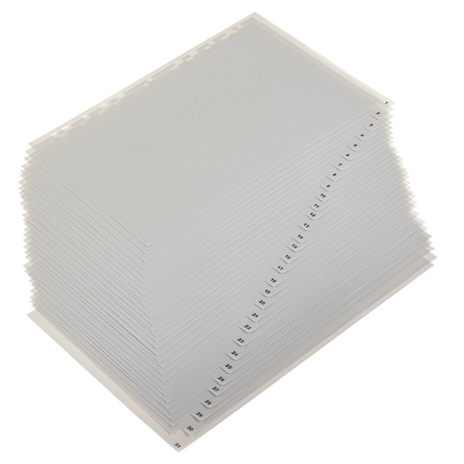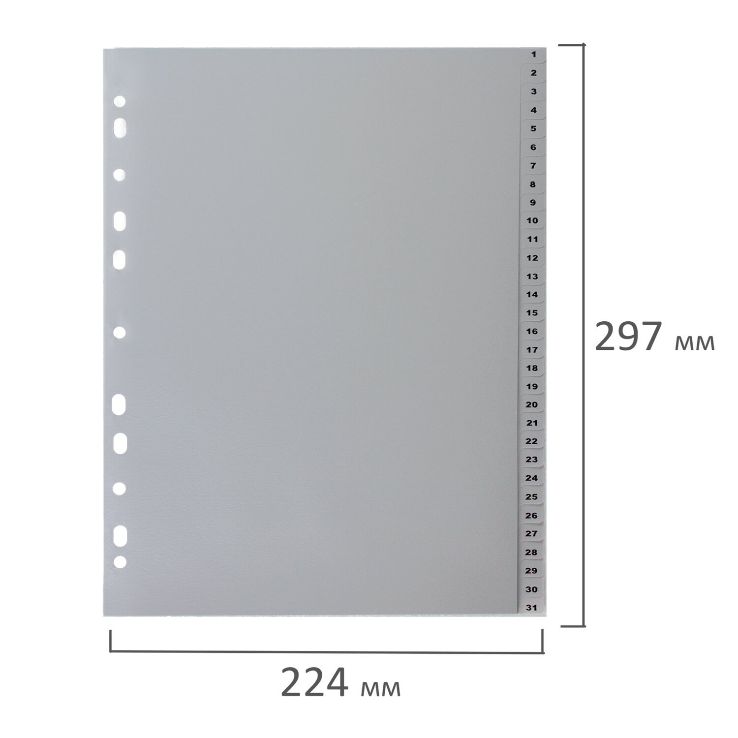 Изготовлены из пластика толщиной 0,12 мм. В комплект входит 31 лист серого цвета, обеспечивающих возможность сортировки документов по цифрам, а также титульный лист для оглавления. Универсальная перфорация позволяет подшивать разделители во все типы папок. Размер - 224х297 мм.