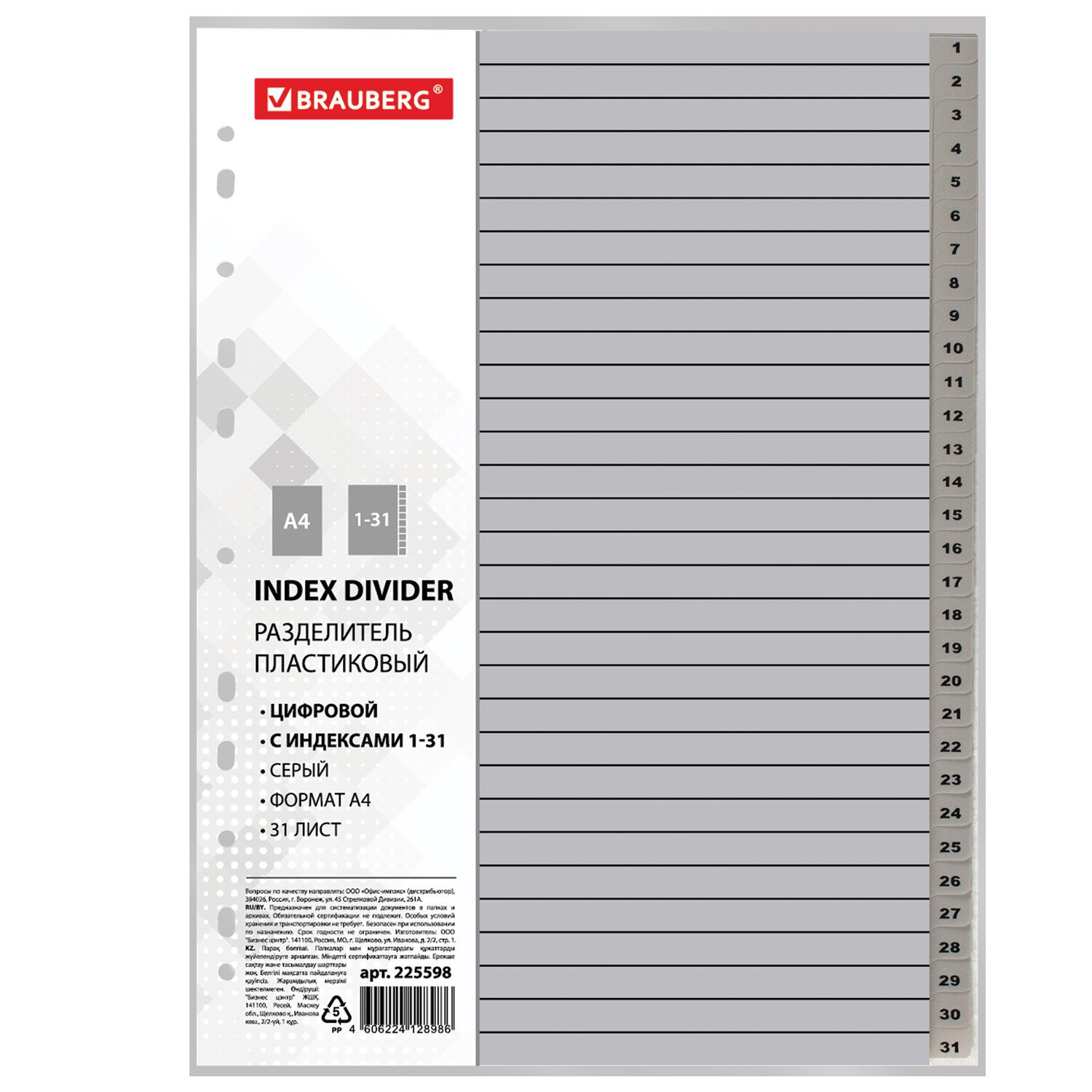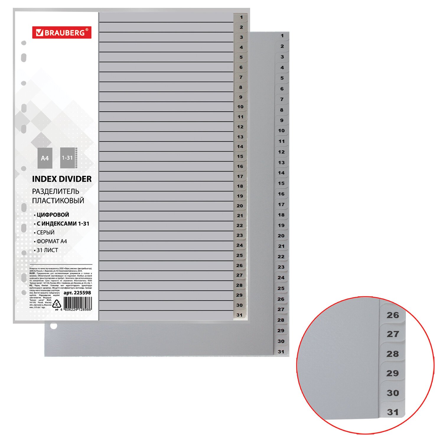 Разделитель пластиковый BRAUBERG, А4, 31 лист, цифровой 1-31, оглавление, серый, РОССИЯ, 225598