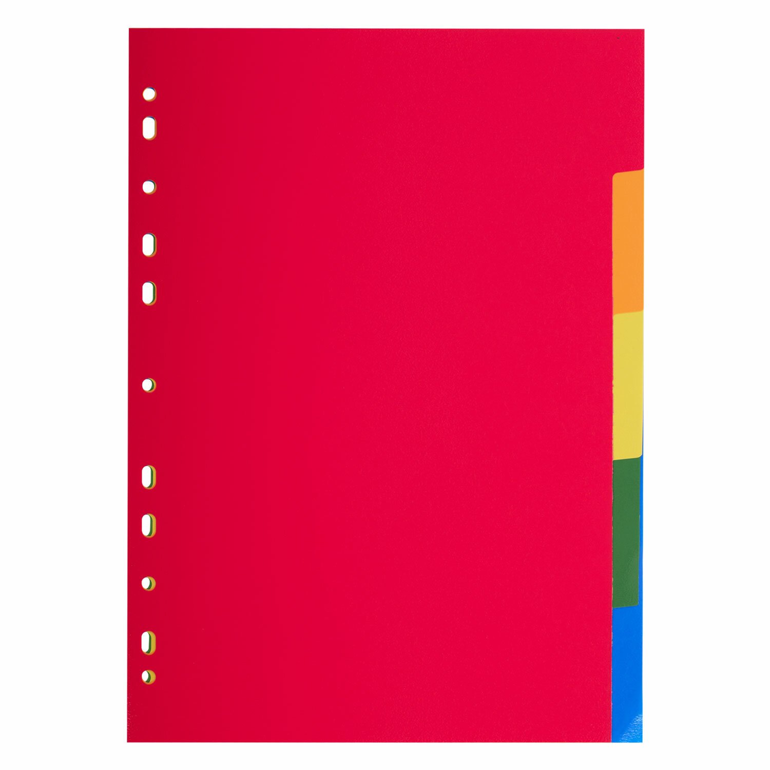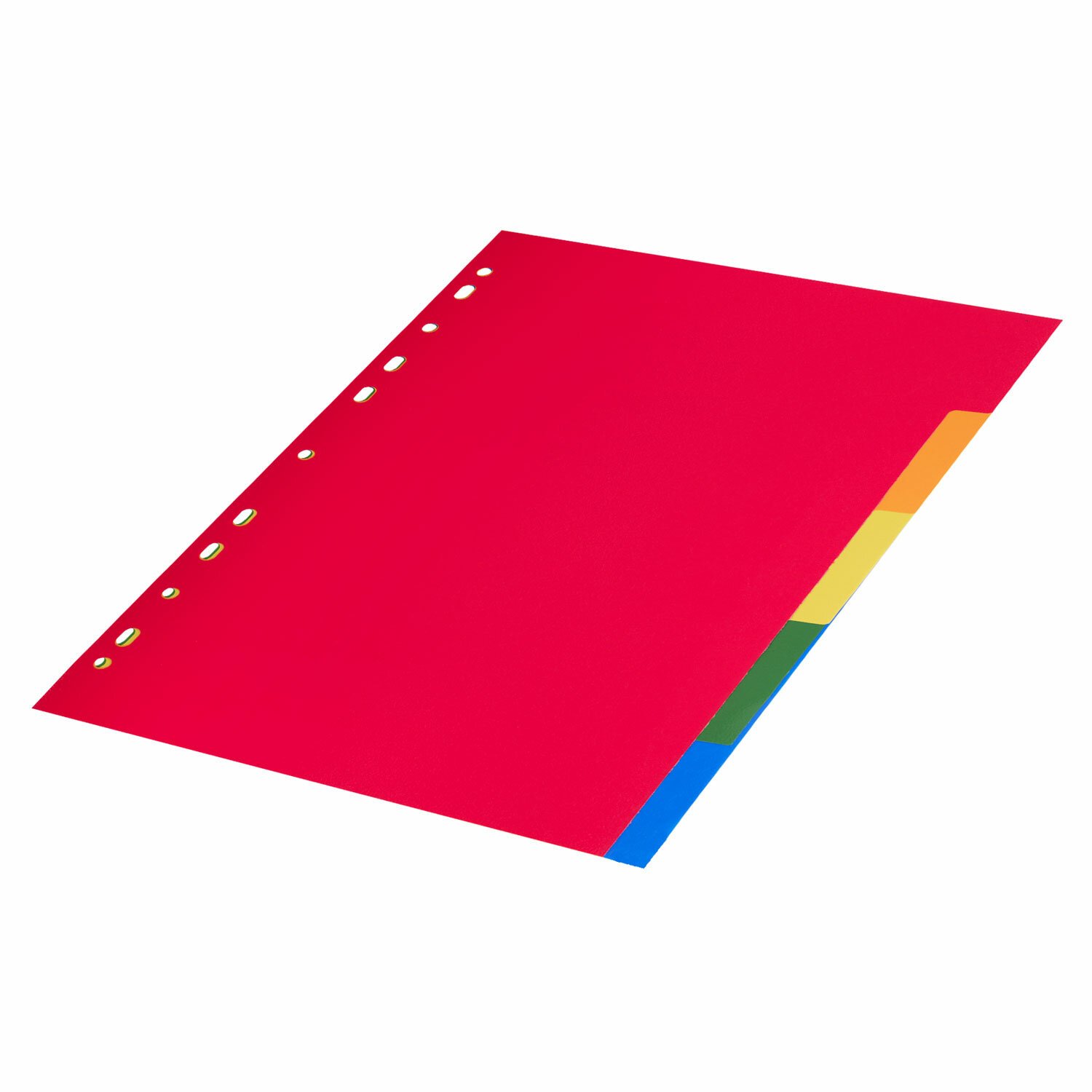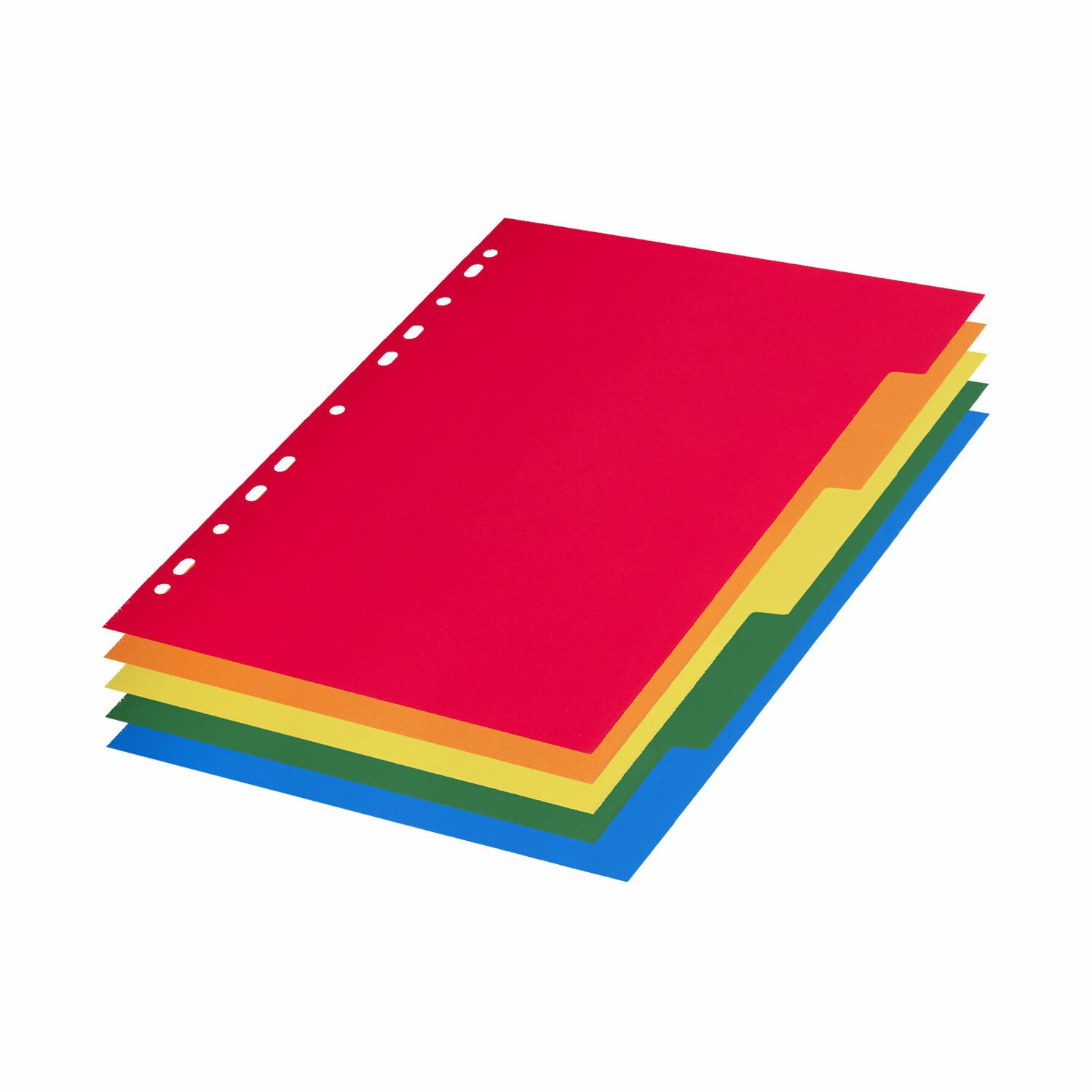 Изготовлены из пластика толщиной 0,13 мм. В комплекте 5 цветов: синий, зеленый, желтый, оранжевый, красный, а также бумажный титульный лист для оглавления. Обеспечивают сортировку документов по пяти разделам. Универсальная перфорация позволяет подшивать разделители во все типы папок.