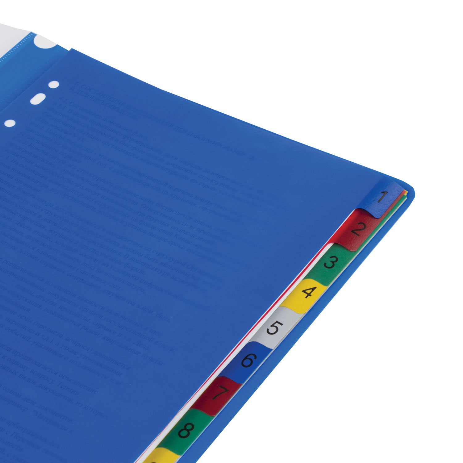 Изготовлены из пластика толщиной 0,12 мм. В комплект входят 12 листов синего, красного, серого, зеленого и желтого цвета, обеспечивающих возможность сортировки документов по цифрам, а также титульный лист для оглавления. Универсальная перфорация позволяет подшивать разделители во все типы папок. Размер - 224х297 мм.