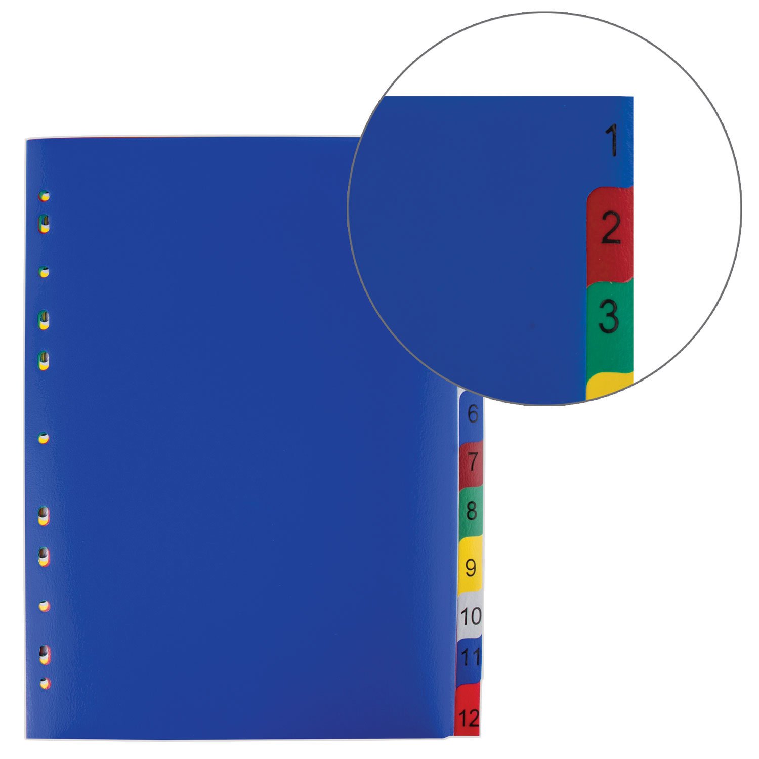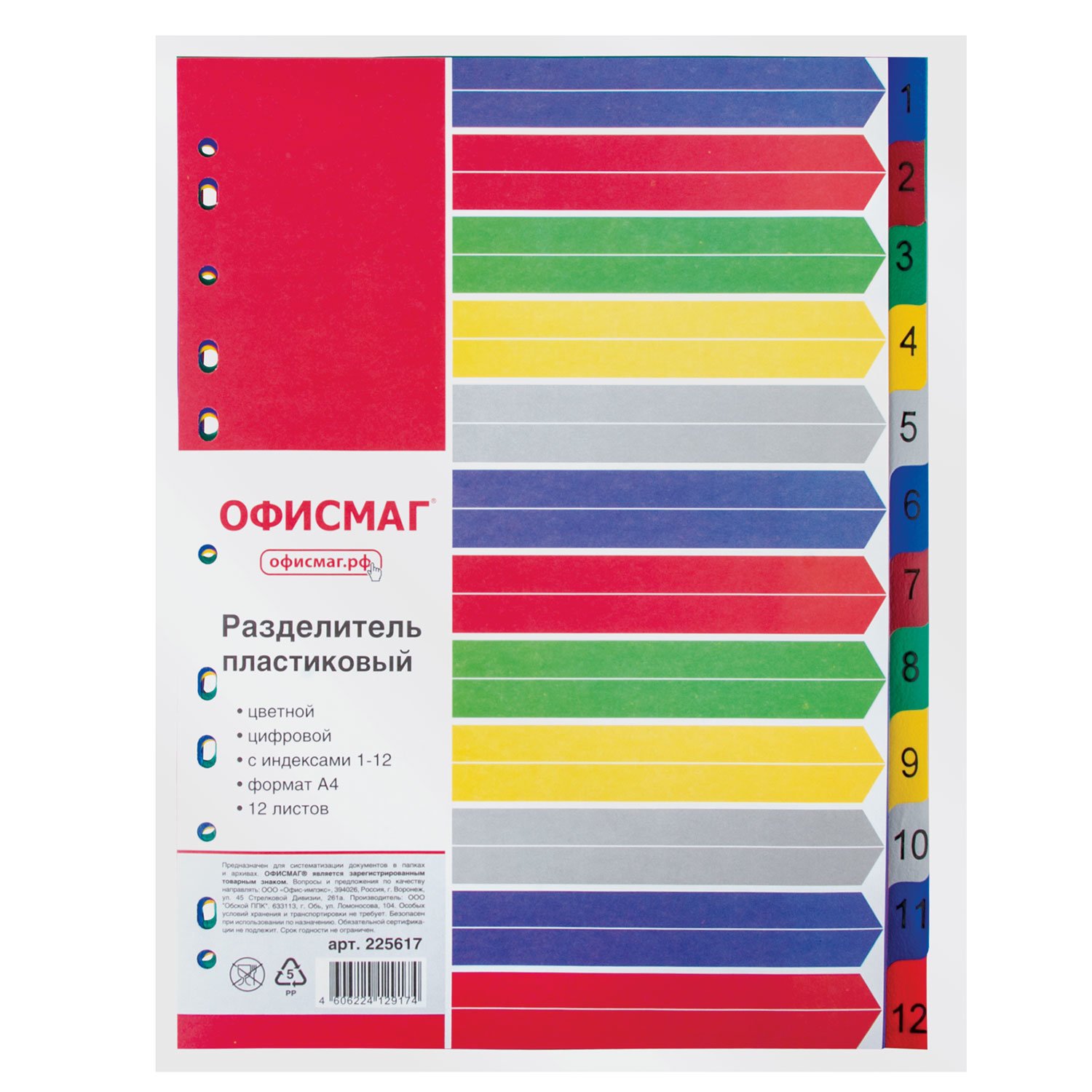 Разделитель пластиковый ОФИСМАГ, А4, 12 листов, цифровой 1-12, оглавление, цветной, РОССИЯ, 225617