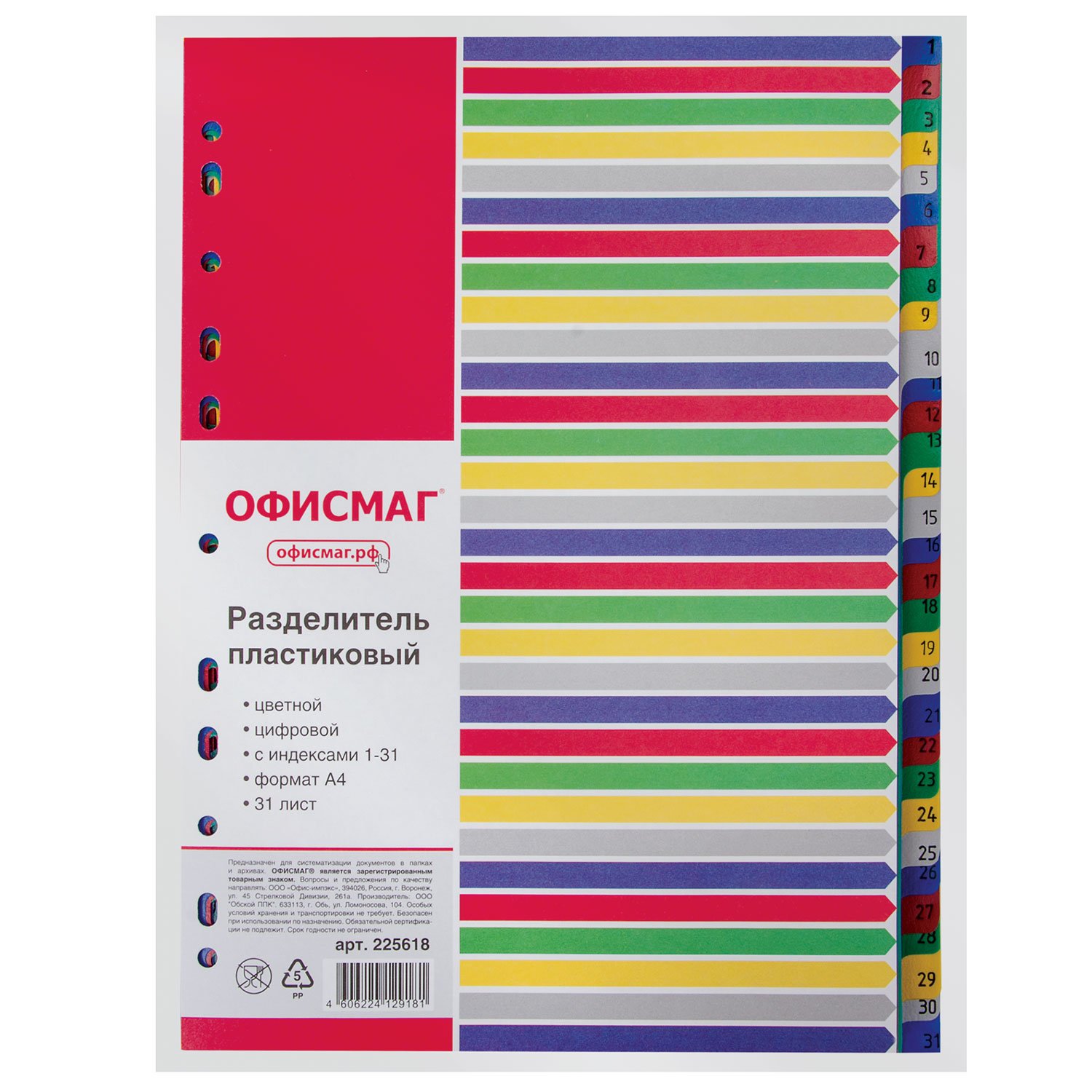 Разделитель пластиковый ОФИСМАГ, А4, 31 лист, цифровой 1-31, оглавление, цветной, РОССИЯ, 225618
