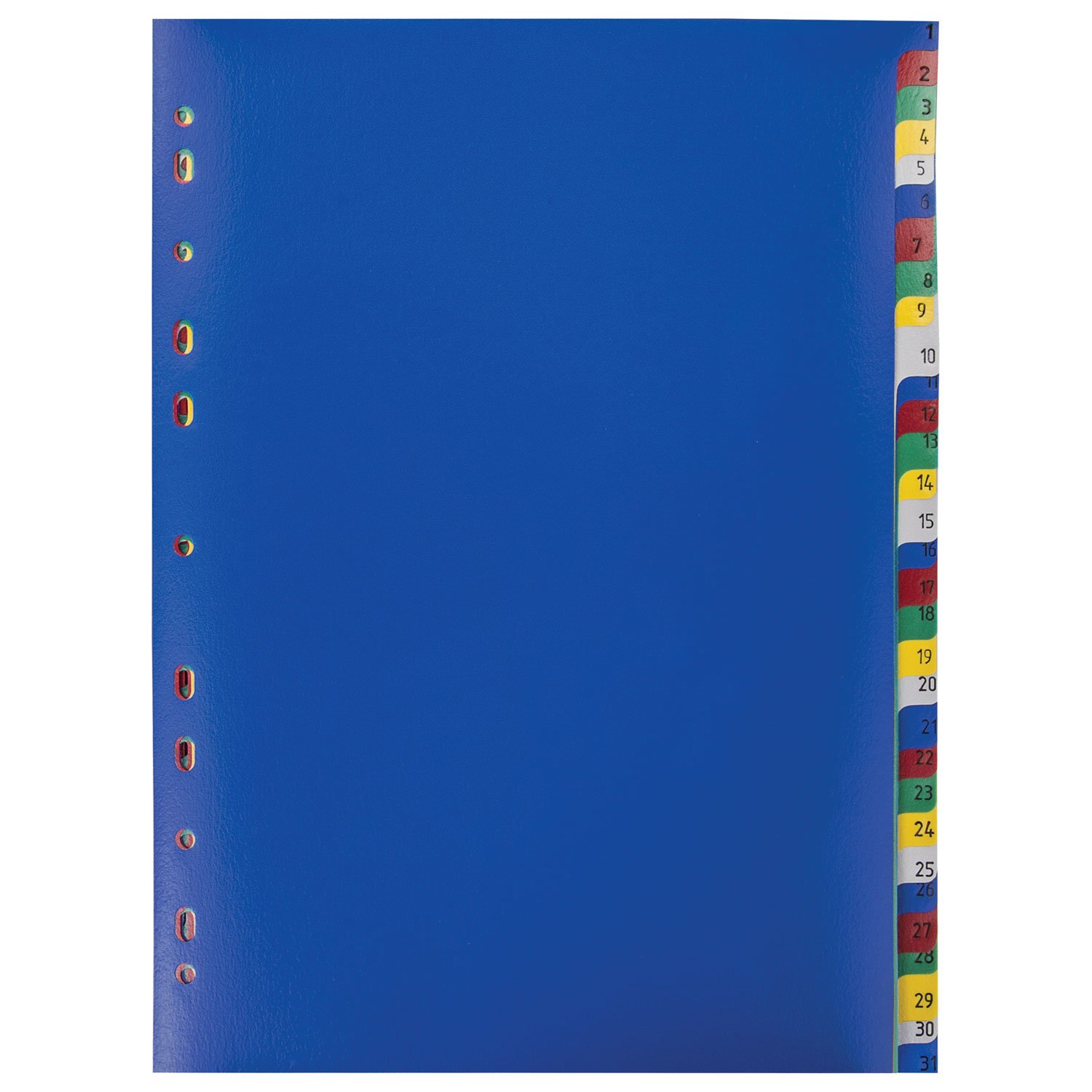 Изготовлены из пластика толщиной 0,12 мм. В комплект входит 31 лист синего, красного, серого, зеленого и желтого цвета, обеспечивающих возможность сортировки документов по цифрам, а также титульный лист для оглавления. Универсальная перфорация позволяет подшивать разделители во все типы папок. Размер - 224х297 мм.