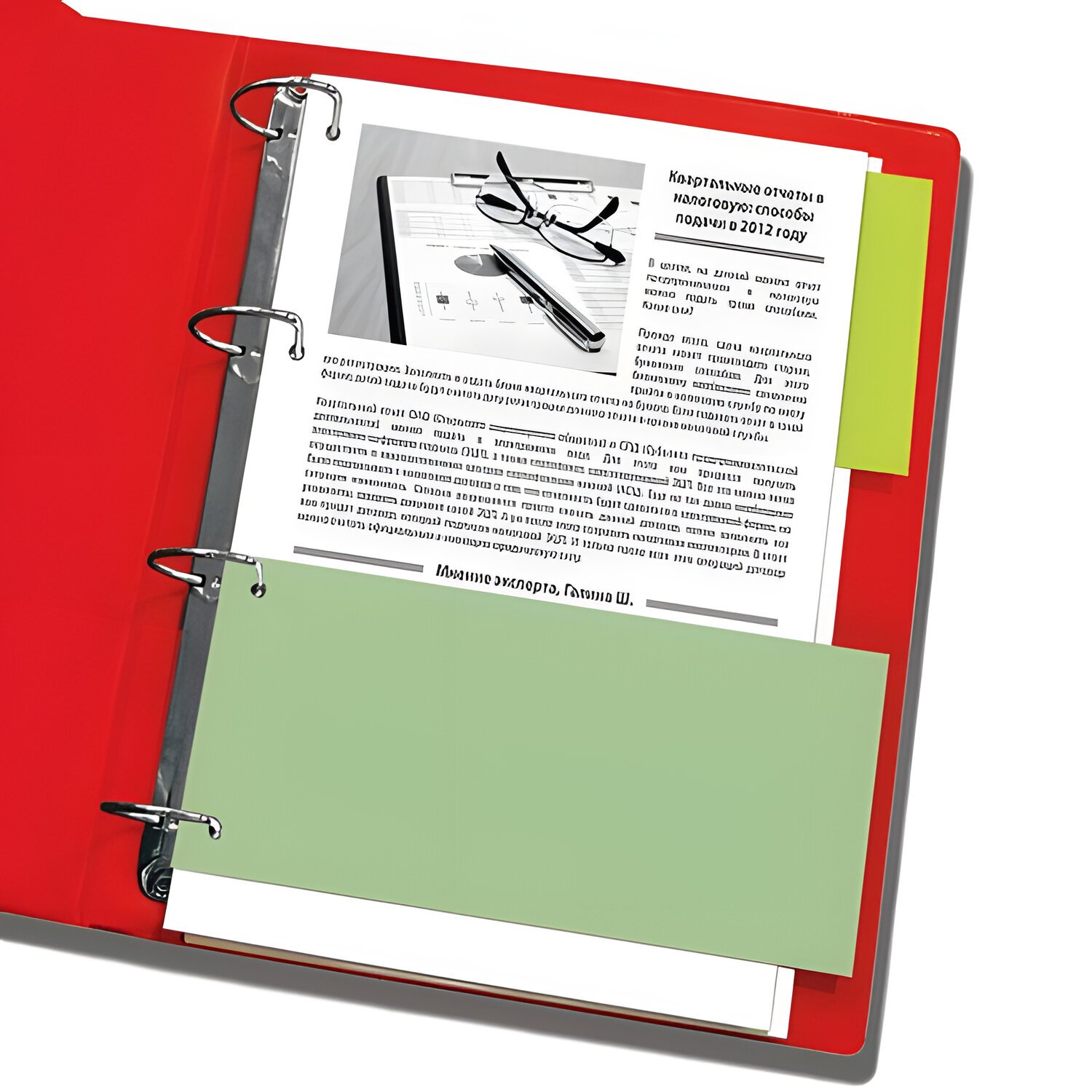 Изготовлены из качественного картона плотностью 160 г/м2. В комплект входят 100 листов размером 240х105 мм зеленого цвета. Универсальная перфорация позволяет подшивать разделители во все типы папок.
