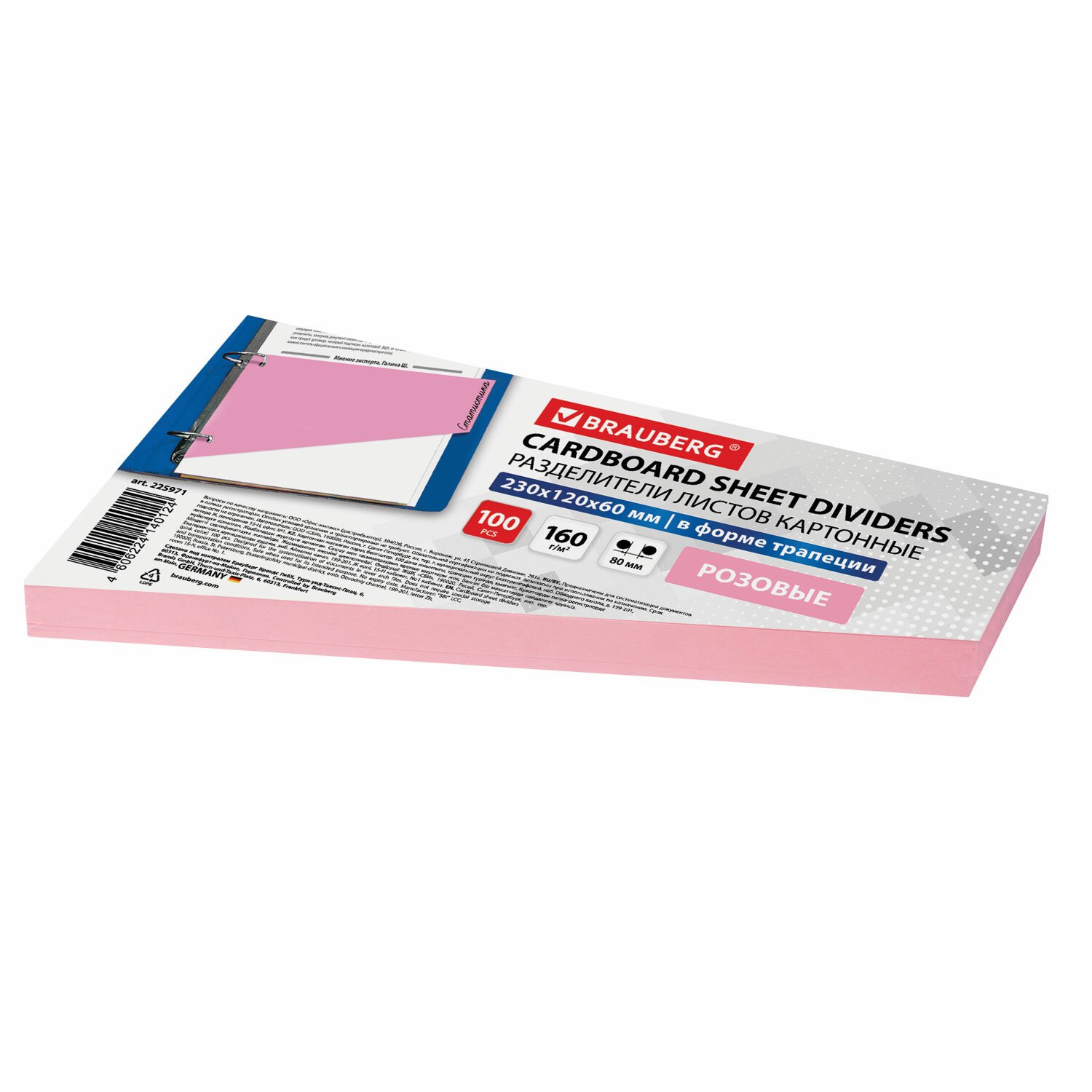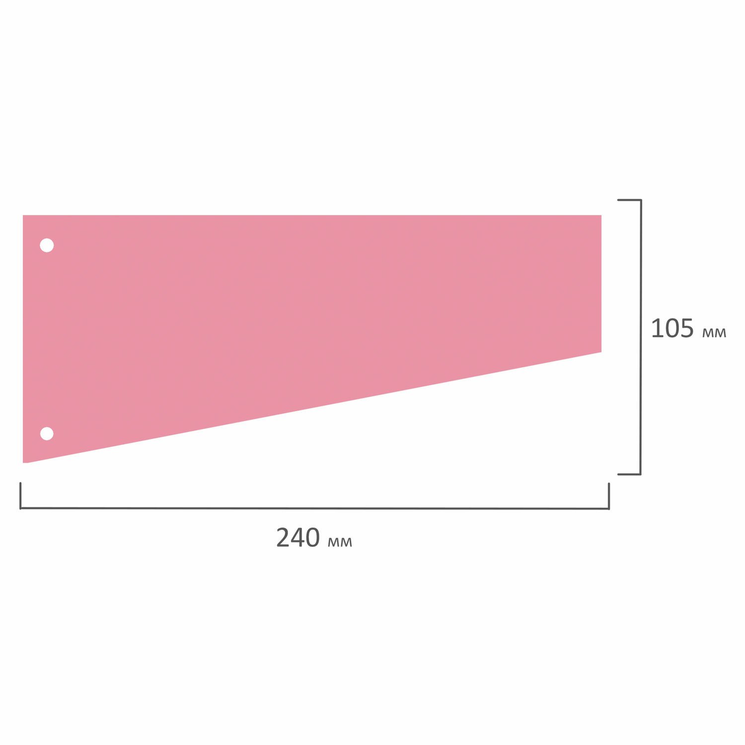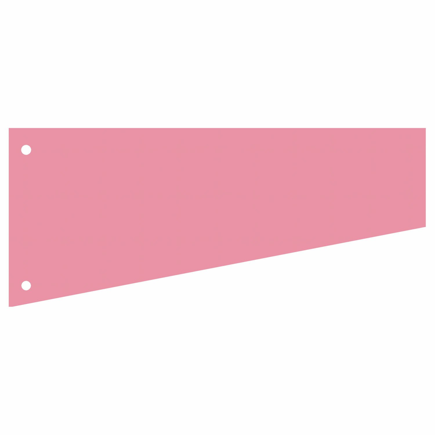 Изготовлены из качественного картона плотностью 160 г/м2. В комплект входят 100 листов трапецевидной формы размером 230х120 мм розового цвета. Универсальная перфорация позволяет подшивать разделители во все типы папок.