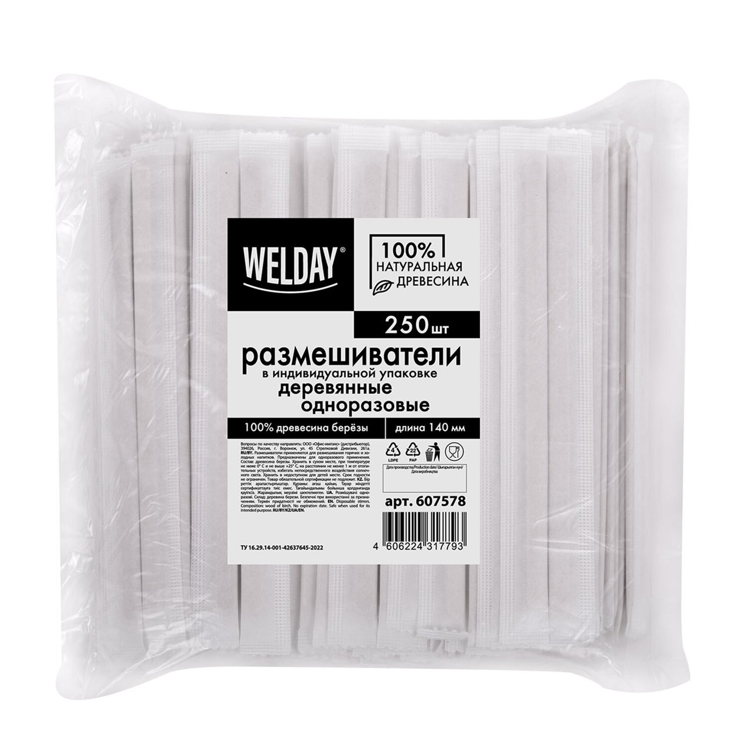 Размешиватель одноразовый деревянный в индивидуальной упаковке 180 мм, КОМПЛЕКТ 250 шт., WELDAY, 607579, 97