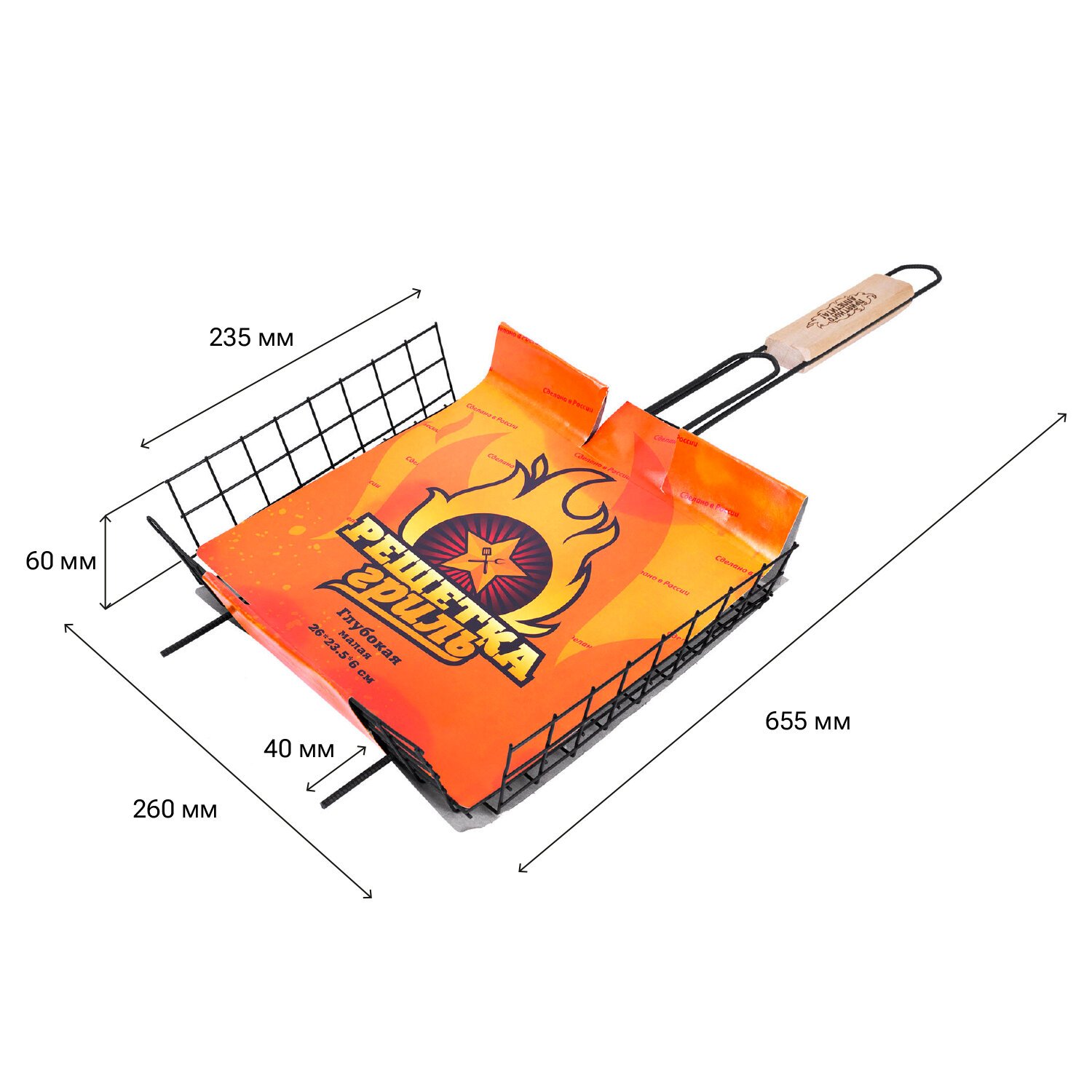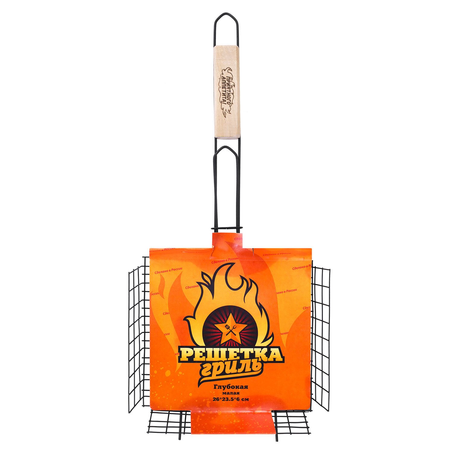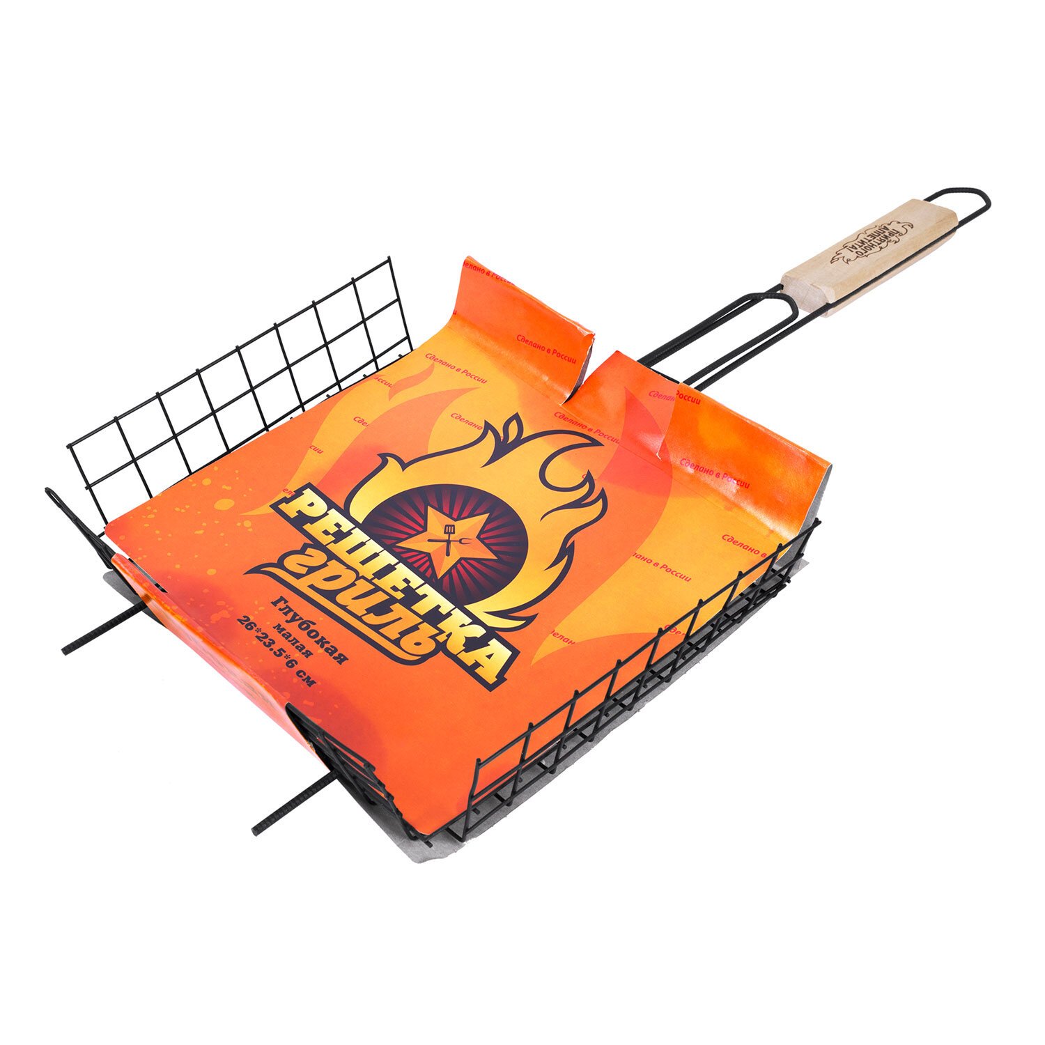Решетка-гриль глубокая универсальная с рабочей поверхностью 26х23,5x6 см — отличное решение для приготовления мяса, грибов, овощей и иных блюд на открытом огне. Глубина решётки позволяет удобно размещать и надёжно фиксировать крупные куски мяса, рыбу или овощи. Прутики из прочной стали выдерживают высокие температуры и обеспечивают долгий срок службы. Оксидированное покрытие защищает от коррозии, устойчиво к огню и безопасно для здоровья. Конструкция плотно закрывается и надёжно удерживает продукты при готовке. Деревянная рукоятка не нагревается, удобно ложится в руку и защищает от ожогов.