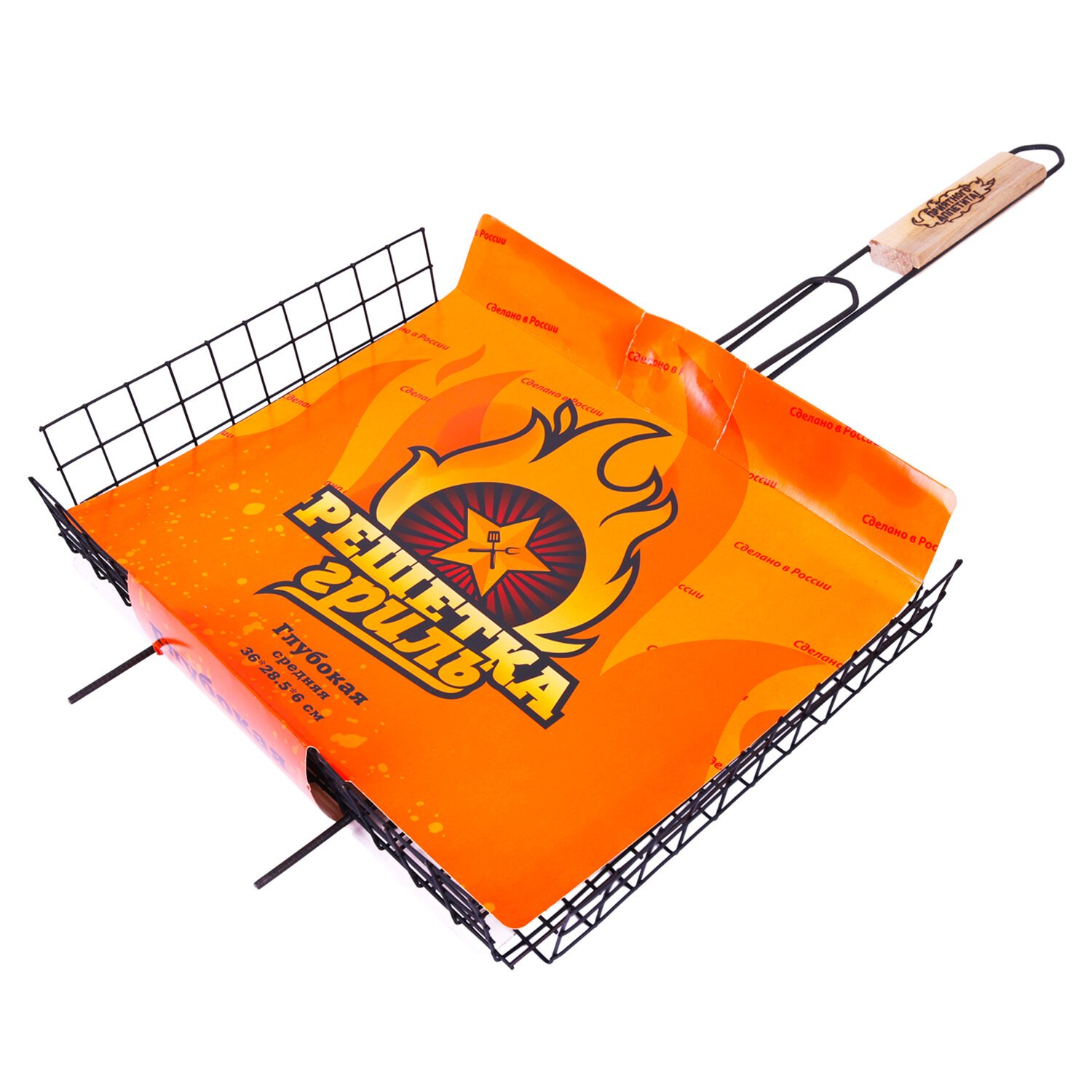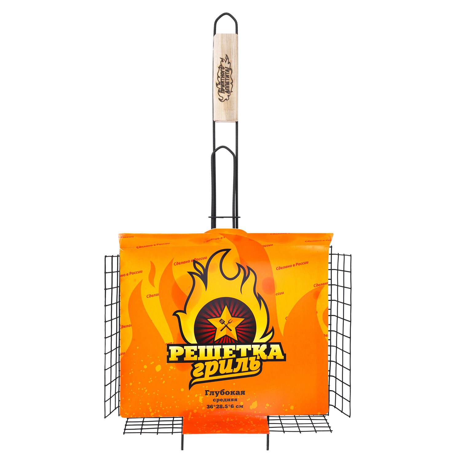 Решетка-гриль глубокая универсальная с рабочей поверхностью 36х28,5x6 см — отличное решение для приготовления мяса, грибов, овощей и иных блюд на открытом огне. Глубина решётки позволяет удобно размещать и надёжно фиксировать крупные куски мяса, рыбу или овощи. Прутики из прочной стали выдерживают высокие температуры и обеспечивают долгий срок службы. Оксидированное покрытие защищает от коррозии, устойчиво к огню и безопасно для здоровья. Конструкция плотно закрывается и надёжно удерживает продукты при готовке. Деревянная рукоятка не нагревается, удобно ложится в руку и защищает от ожогов.