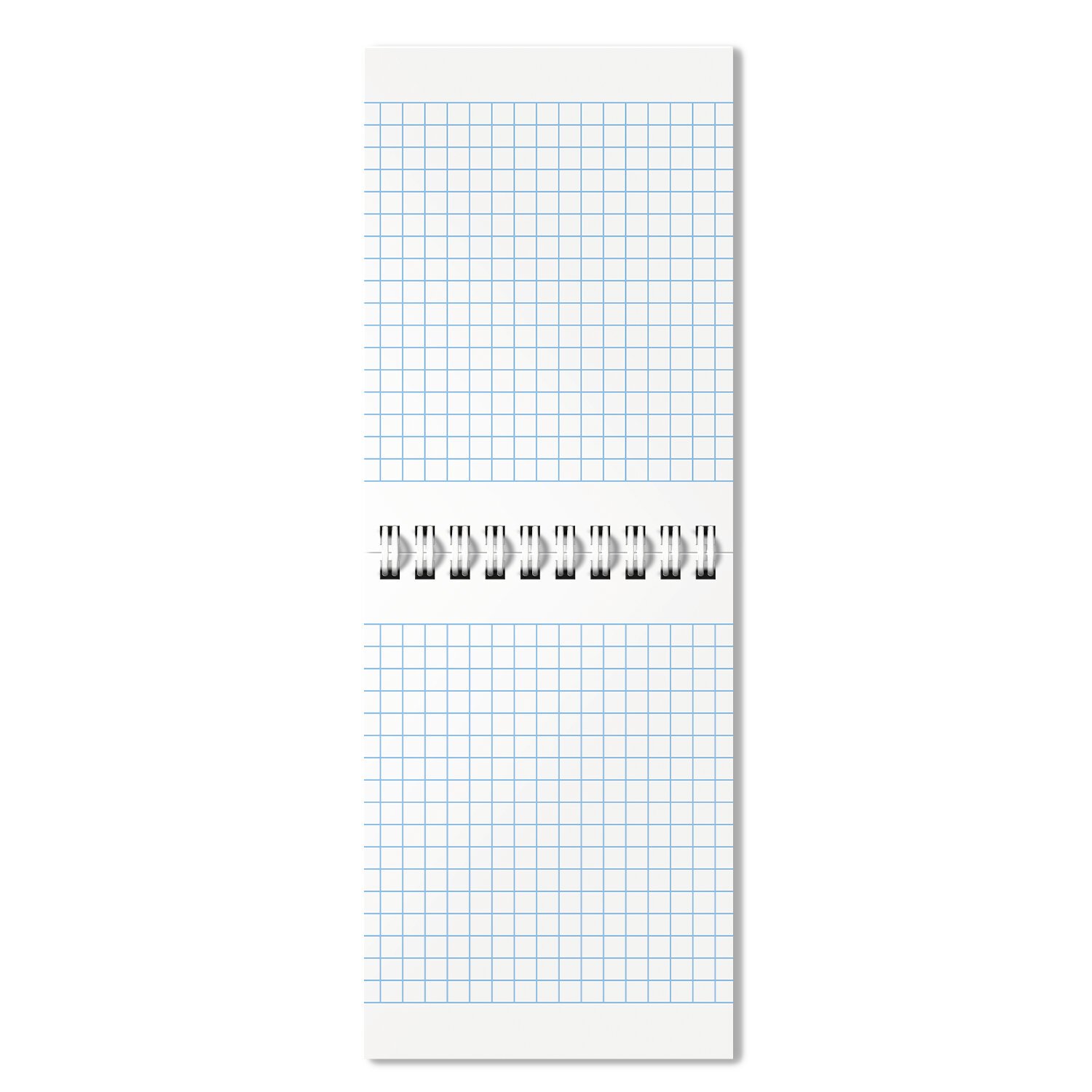 Блокнот формата А7 на гребне содержит 40 листов с линовкой в клетку. Гребень расположен сверху. Обложка выполнена из мелованного картона плотностью 190 г/м2. Внутренний блок состоит из белой офсетной бумаги плотностью 60 г/м2.
