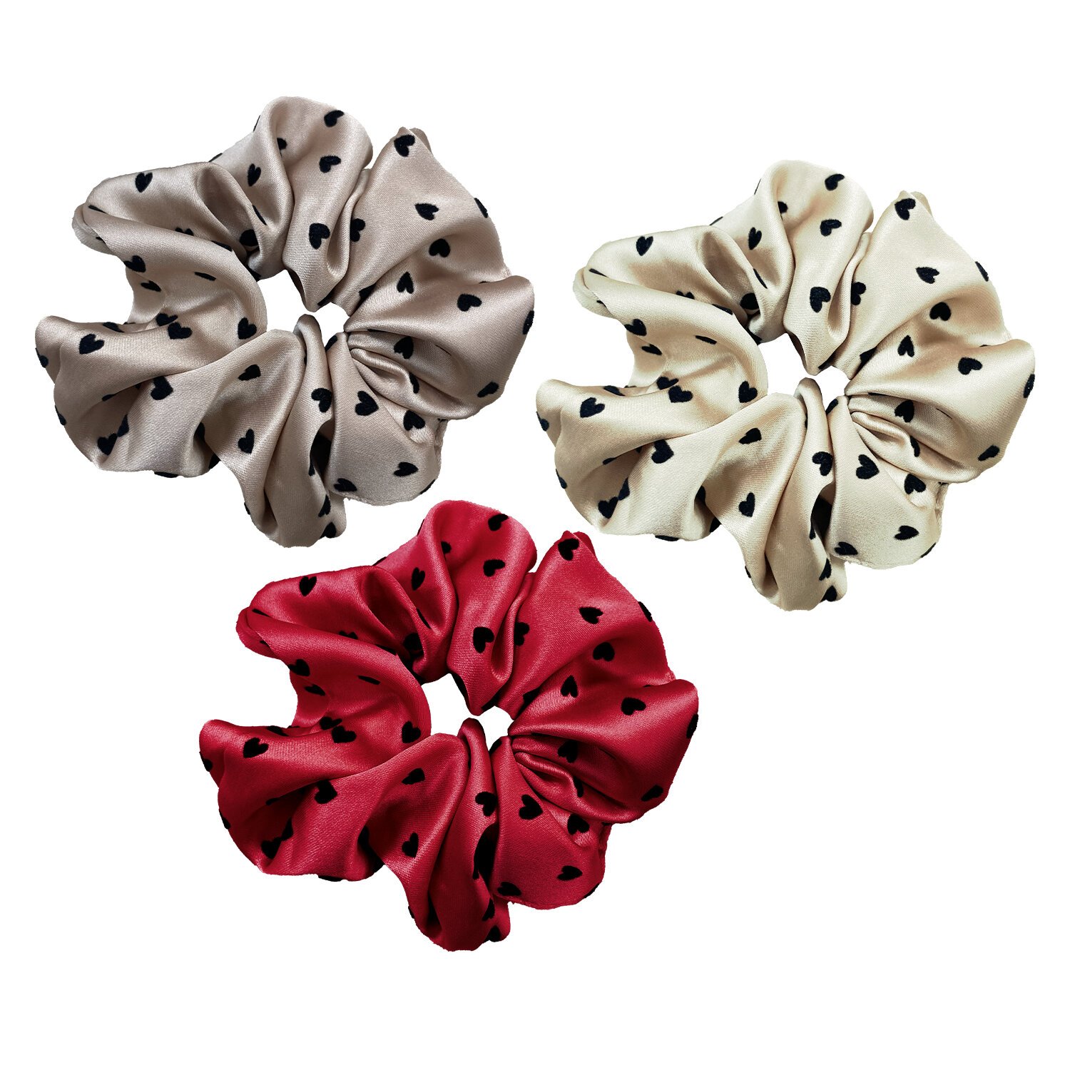 Резинка-скранч из мягкого полиэстера разных цветов в трендовом дизайне в горох в виде романтичных сердечек – универсальный аксессуар для создания объемных пучков и свободных хвостов. Большой размер (5x25 см) подчеркивает текстуру волос, а эластичный материал не оставляет заломов и подстраивается под густоту прядей.