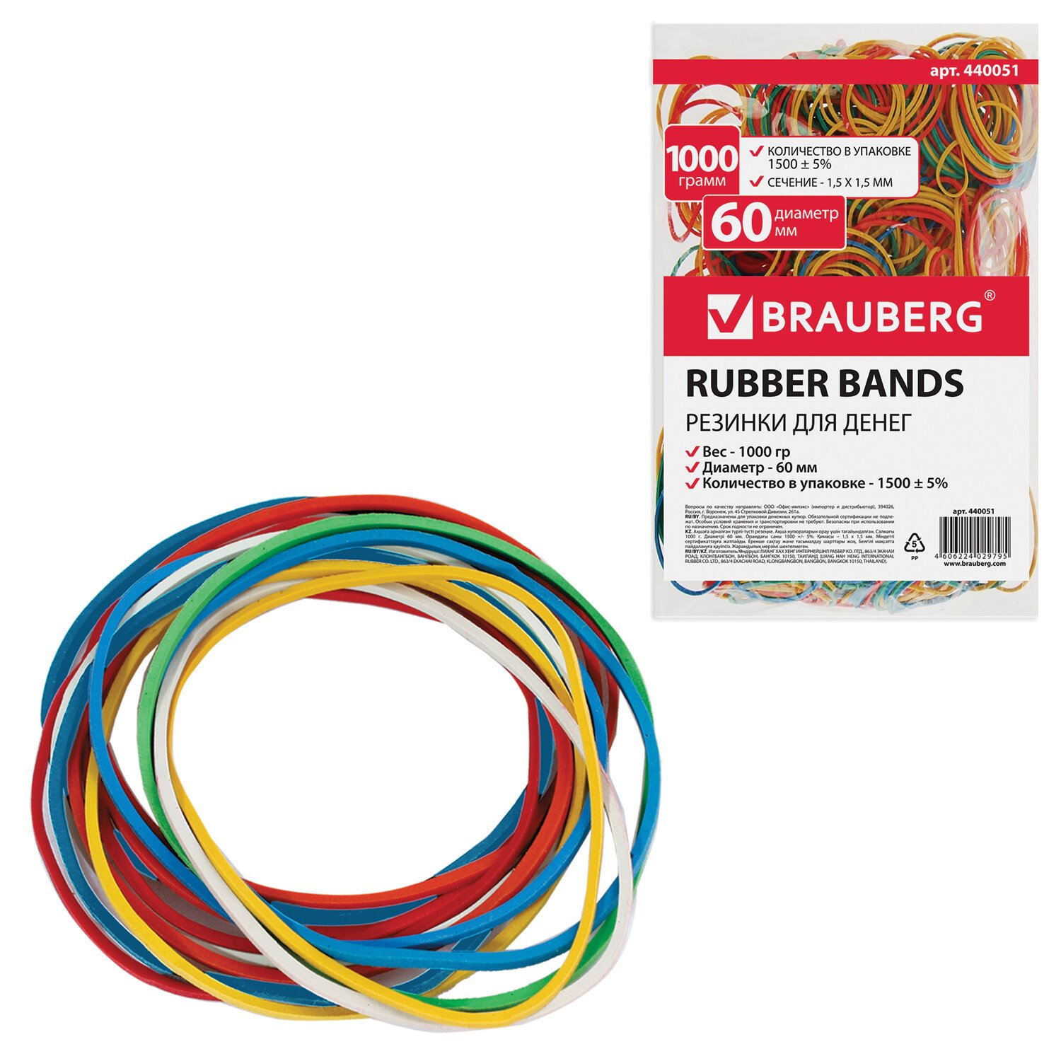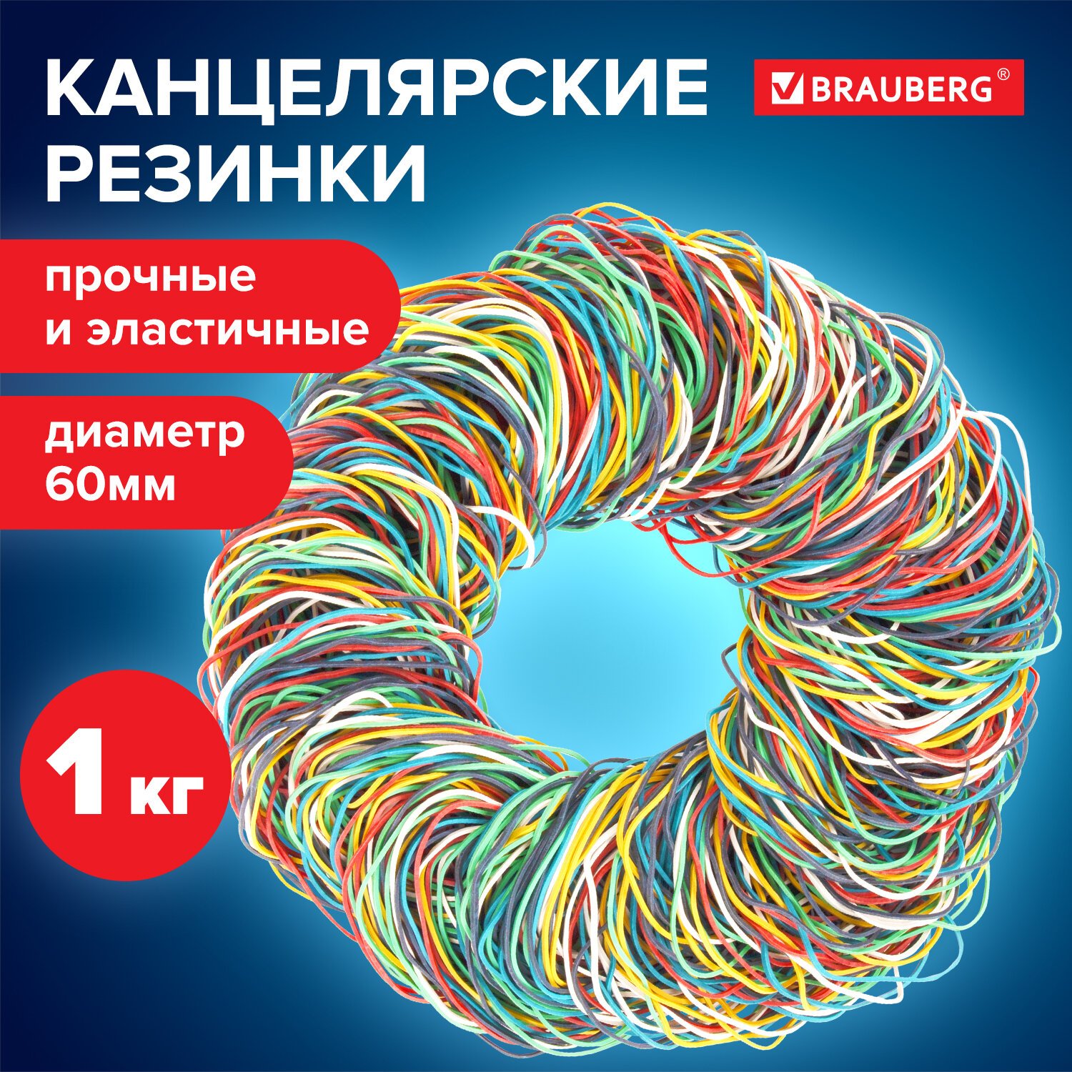Резинки банковские универсальные диаметром 60 мм, BRAUBERG 1000 г, цветные, натуральный каучук, 440051