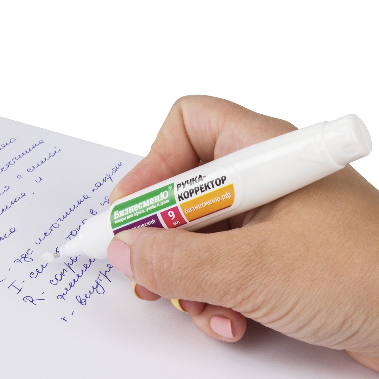 Ручка-корректор БИЗНЕСМЕНЮ исправляет как рукописный, так и печатный текст на любых типах бумаги.