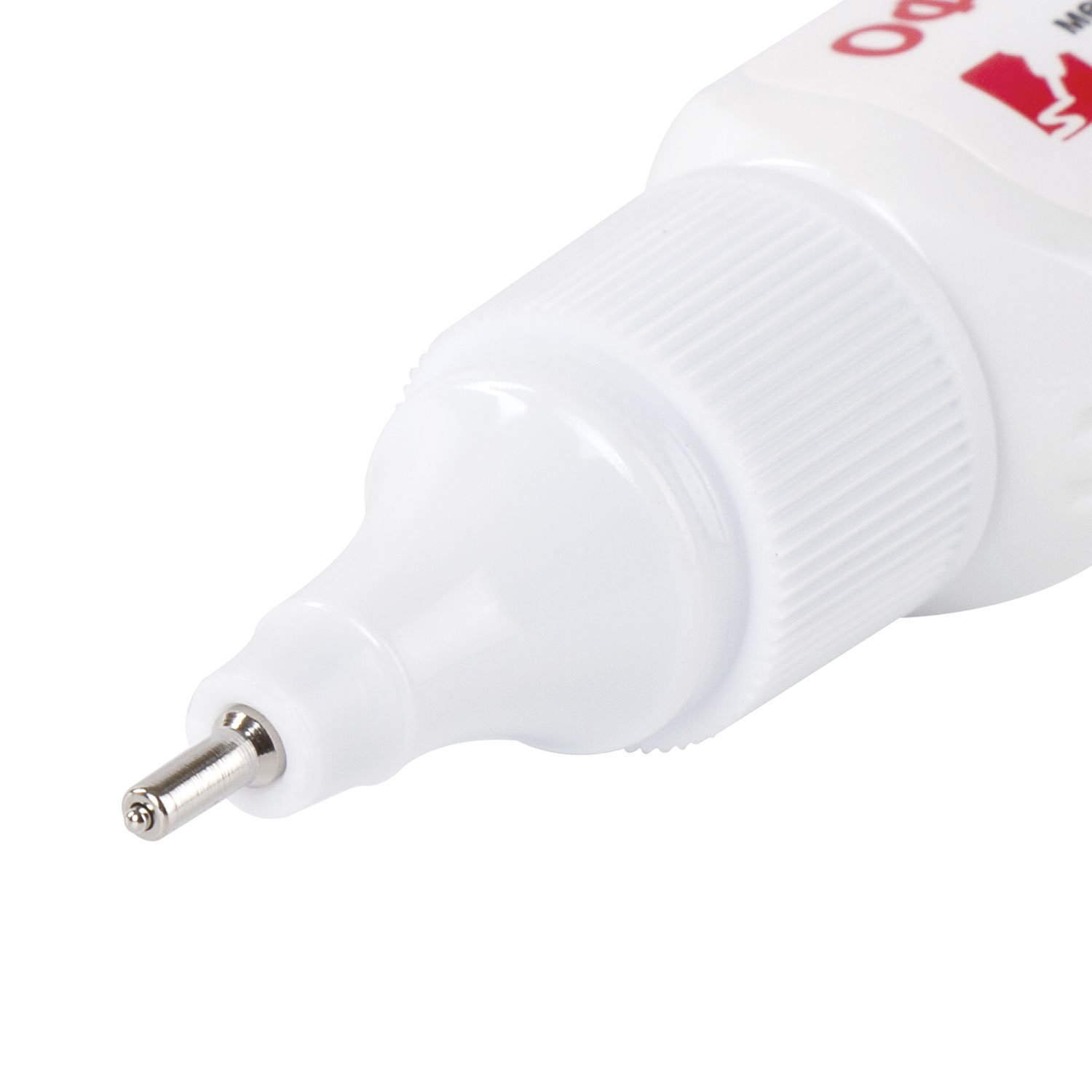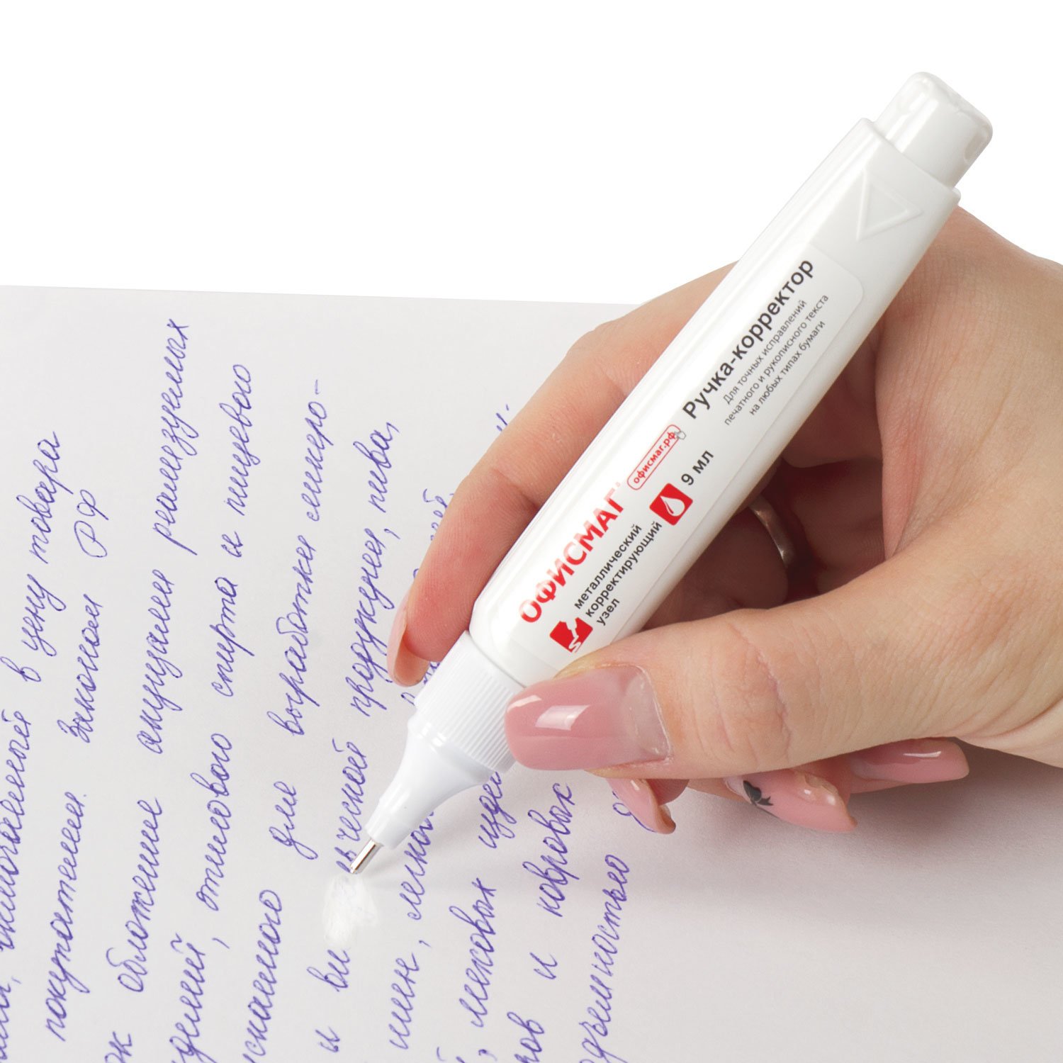 Быстросохнущая корректирующая ручка на спиртовой основе имеет объем 9 мл и обладает устойчивостью к морозу. Корректор оснащен клапанным механизмом, и подача жидкости осуществляется с помощью нажатия на наконечник ручки. Самопроизвольно жидкость не вытекает из ручки. Не оказывайте на корпус ручки повышенное физическое давление, за исключением случаев, когда ручкой давно не пользовались. Перед началом использования ОБЯЗАТЕЛЬНО встряхните ручку.