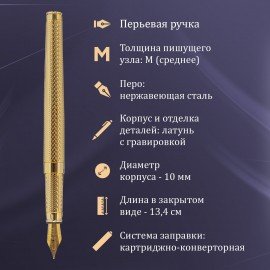 Ручка: Синий цвет чернил; иридиевое перо украшено гравировкой. Диаметр пишущего узла - 0,8 мм. Тип пера M (Medium) - средняя ширина линии. Поставляется в индивидуальном подарочном футляре. Подходит для гравировки. Картридж находится внутри корпуса.