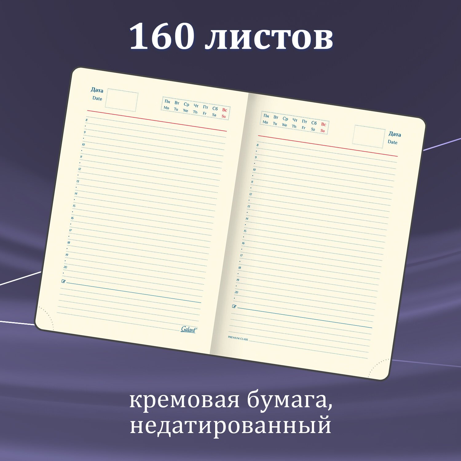 Ежедневник: Внутренний блок включает 160 листов тонированной бумаги плотностью 70 г/м2. Каждая страничка имеет перфорированный угол. Благодаря стандартному формату А5 ежедневник удобно использовать как в офисе, так и на выездных деловых встречах. Интегральная обложка, стилизованная под гладкую кожу, фиксируется магнитным клапаном, поэтому ежедневник не откроется в сумке или портфеле и страницы не помнутся. Подходит для горячего тиснения. Срез и форзац ежедневника окрашены в цвет обложки, что придает ему особый шарм. Дополнением является закладка-ляссе, с помощью которой при необходимости можно быстро открыть ежедневник на нужной странице.
