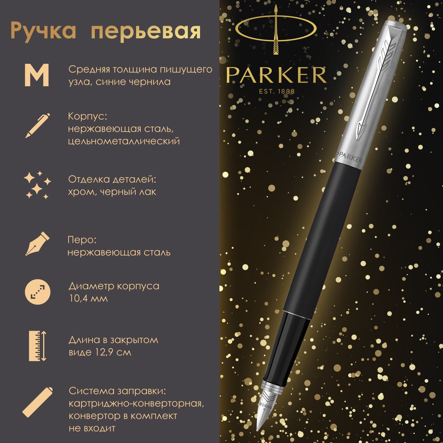 Возможно использование со стандартными чернильными картриджами (75х6 мм) и мини-картриджами (35х6 мм) PARKER, а также стандартным конвертером PARKER для заправки чернилами из флакона.