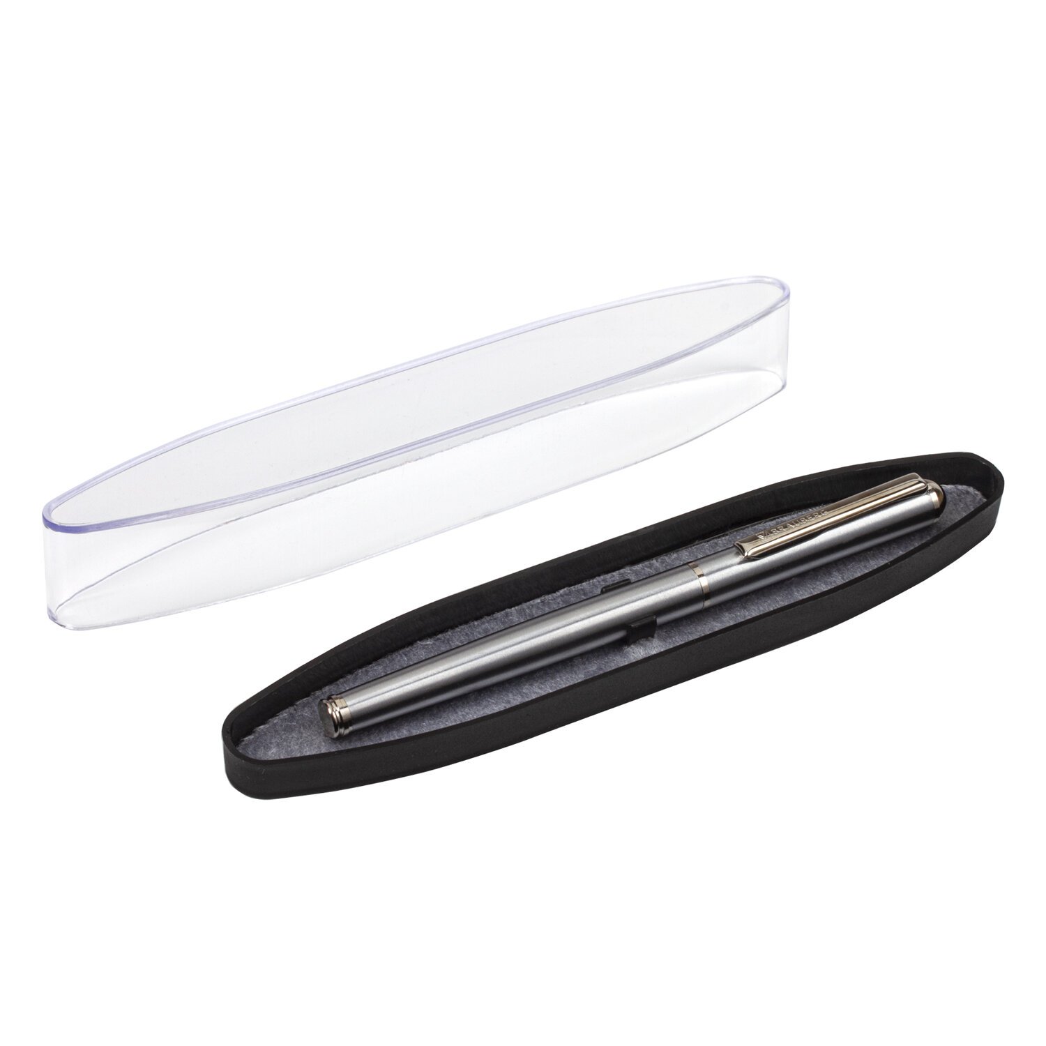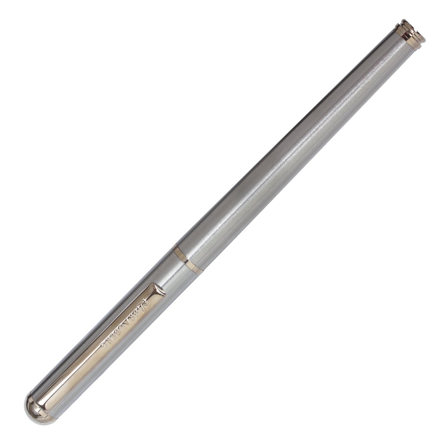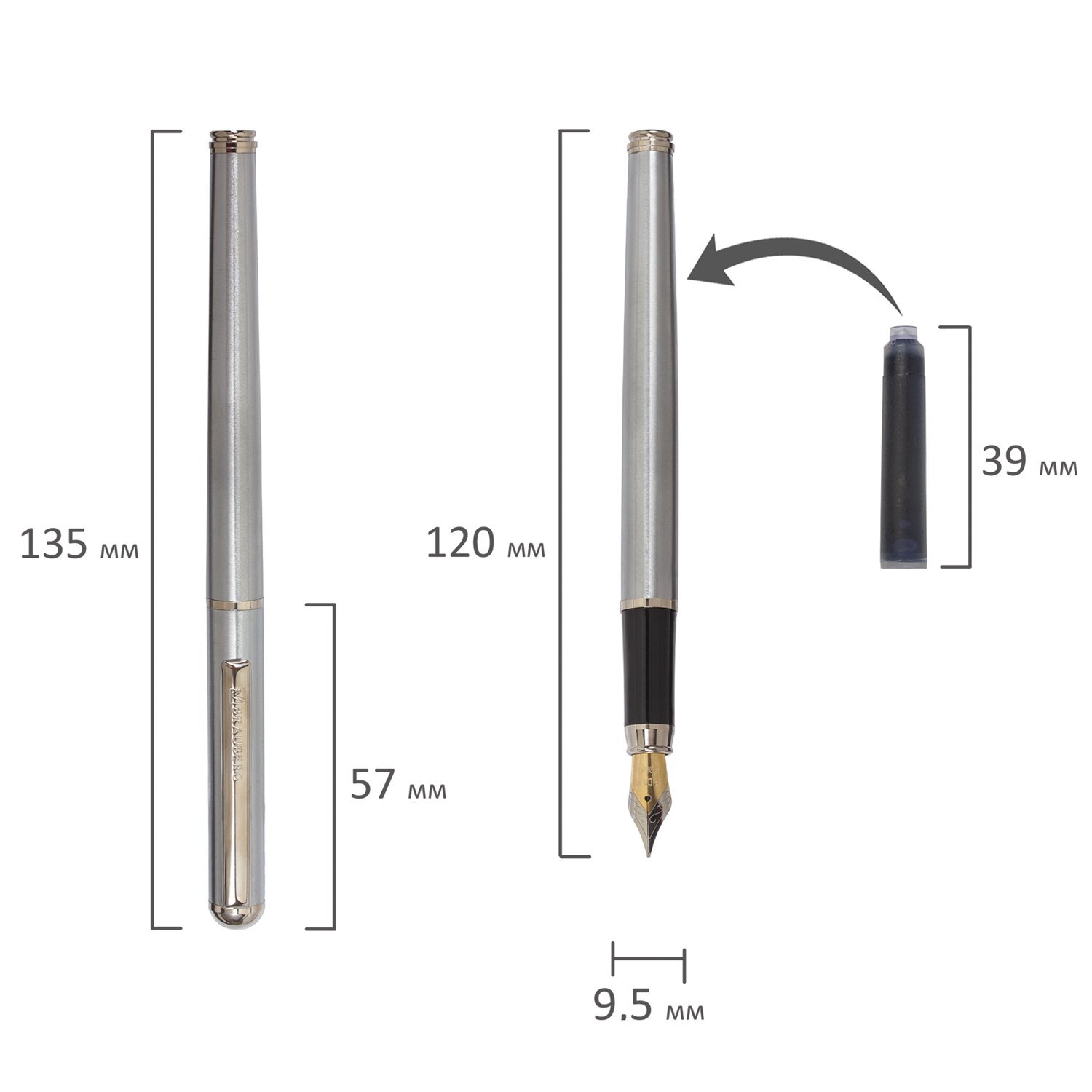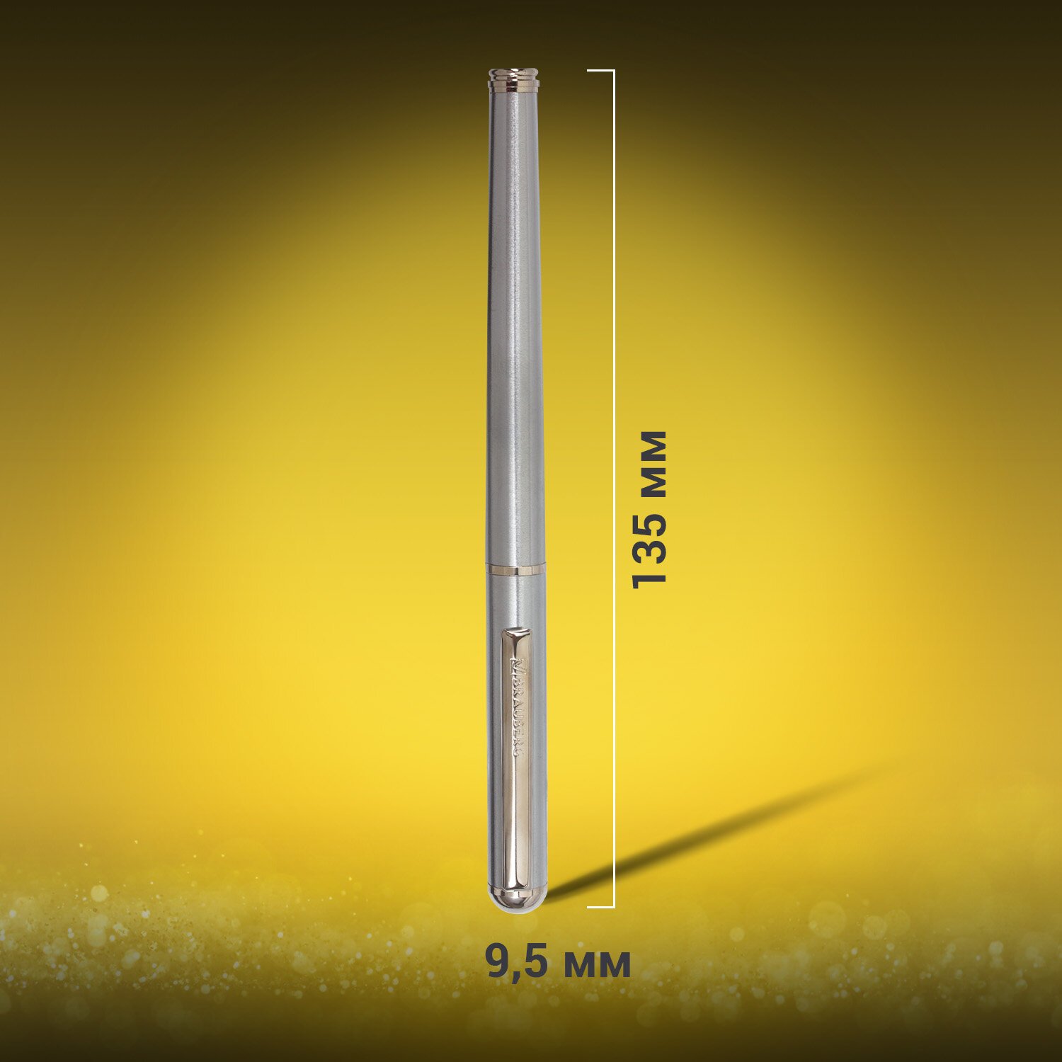 Стильная модель перьевой ручки с корпусом из металла серебристого цвета и хромированными деталями. Синий цвет чернил, иридиевое перо украшено гравировкой. Диаметр пишущего узла 0,5 мм. Тип пера M (Medium) – средняя ширина линии. Размер картриджа – 39 мм.