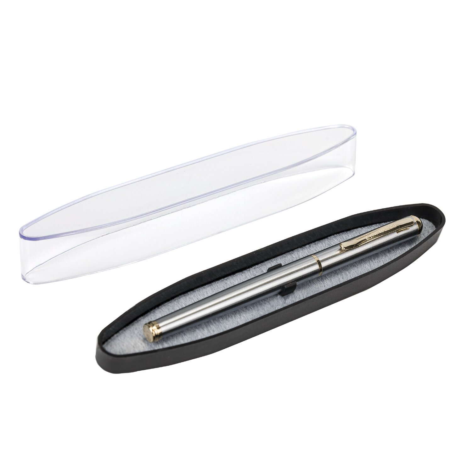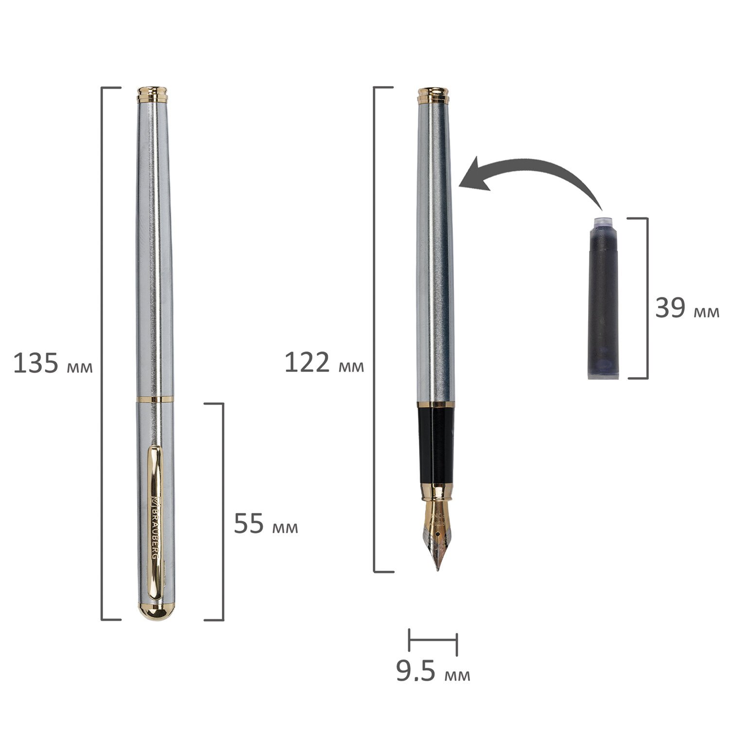 Стильная модель перьевой ручки с корпусом из металла серебристого цвета и золотистыми деталями. Синий цвет чернил, иридиевое перо украшено гравировкой. Диаметр пишущего узла 0,5 мм. Тип пера M (Medium) – средняя ширина линии. Размер картриджа – 39 мм.