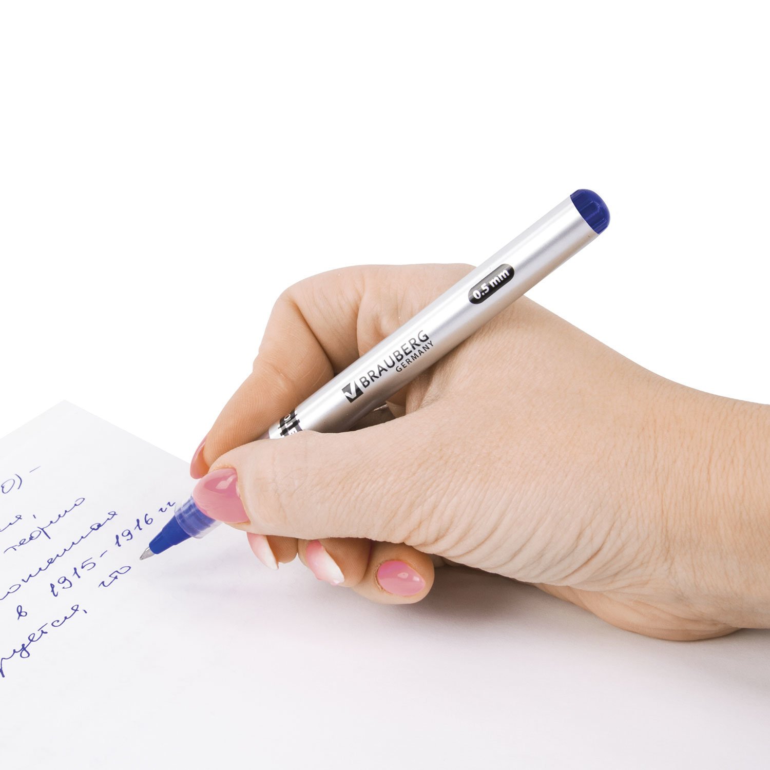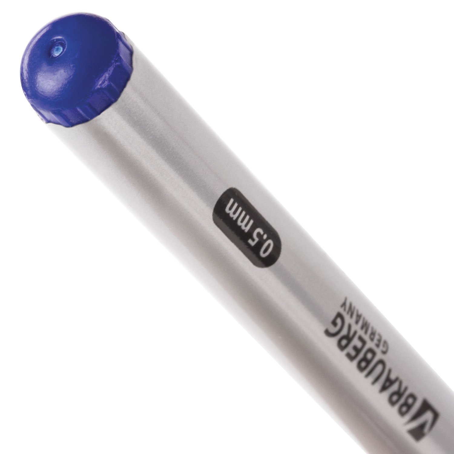 Имеет круглый корпус серебристого цвета с печатью и стандартный наконечник. Цвет деталей соответствует цвету чернил. Конусообразный пишущий узел толщиной 0,5 мм создает линию письма, равную 0,3 мм. Имеется окошко для проверки уровня чернил. Подходит для письма на копиях, сделанных под копирку. Цвет чернил - синий.