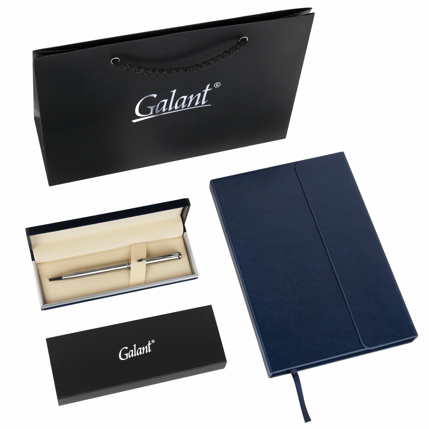 Набор состоит из элегантной ручки с корпусом из латуни серебристого цвета и недатированного ежедневника синего цвета с магнитным клапаном. В комплекте с набором поставляется брендированный подарочный пакет, который сделает подарок завершенным.