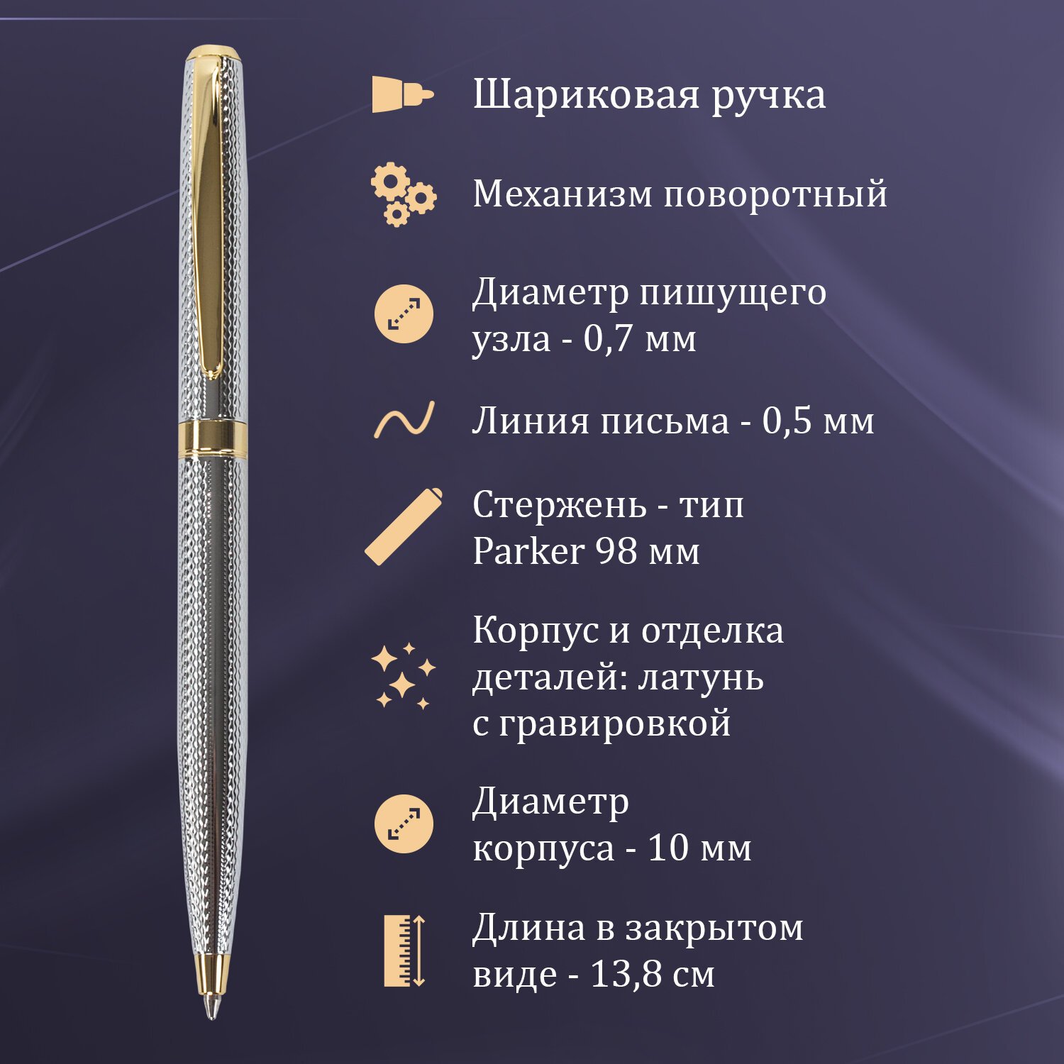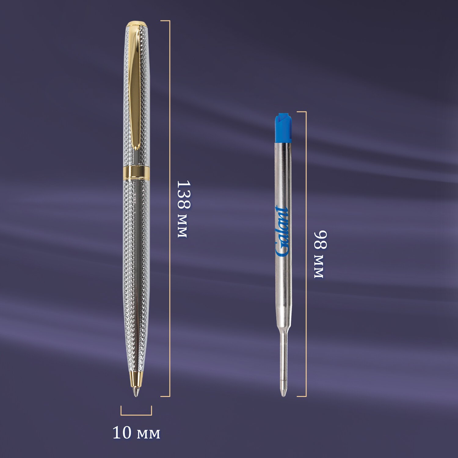 Ручка: синий цвет чернил, длина стержня составляет 98 мм, а диаметр пишущего узла - 0,7 мм. Поставляется в индивидуальном футляре. Корпус ручки подходит для гравировки.
