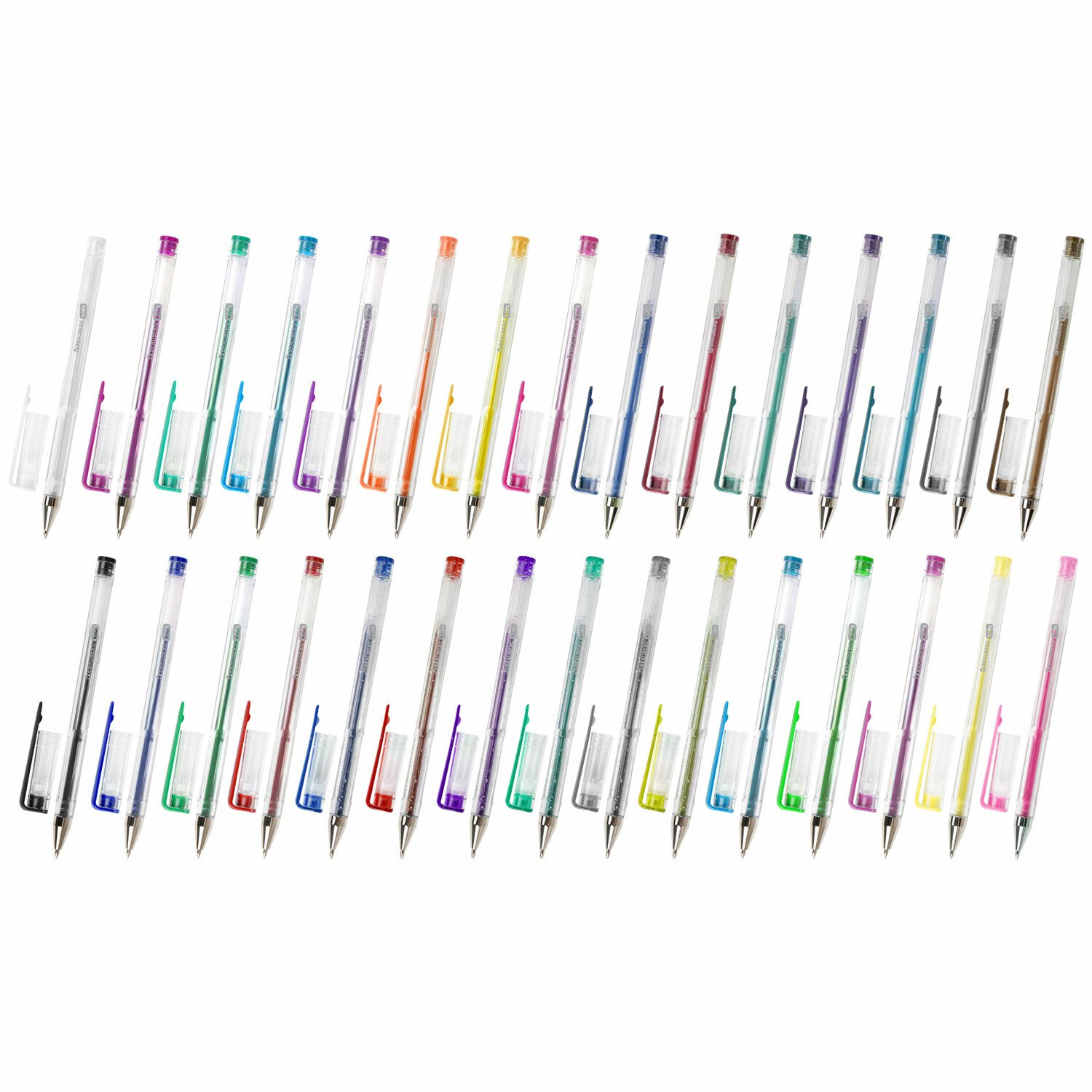 Набор включает 30 гелевых ручек: 4 ручки с классическими чернилами, 6 с блестками, 7 с эффектом металлик, 6 пастельных и 7 неоновых.