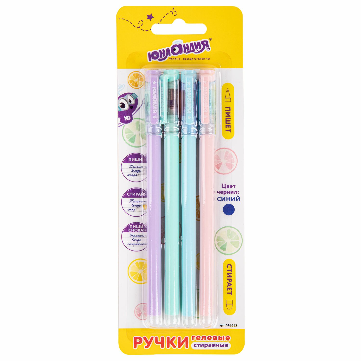 Ручки стираемые гелевые ЮНЛАНДИЯ "Лимонад", НАБОР 4 штуки, СИНИЕ, узел 0,5 мм, линия письма 0,35 мм, 143655