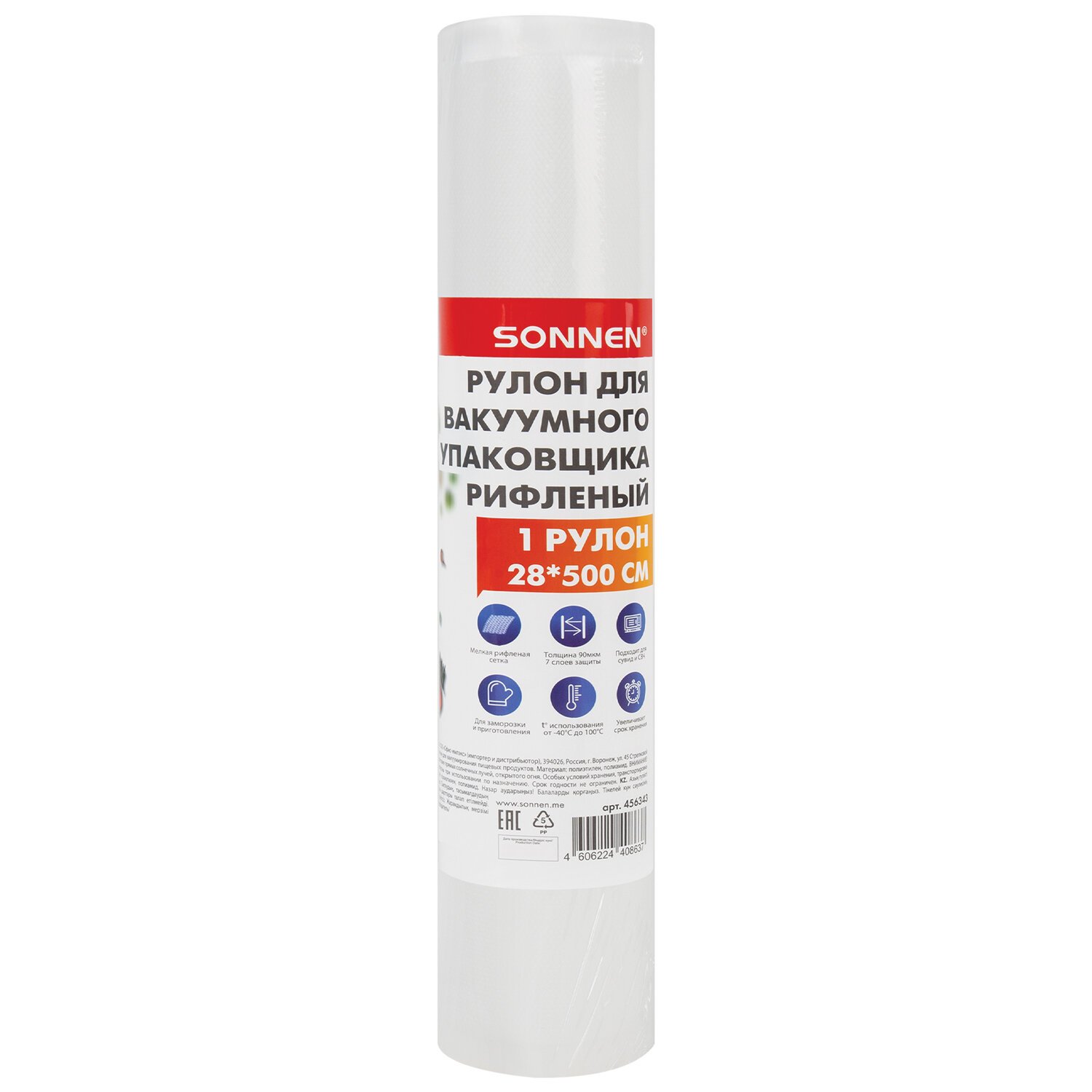 Рулон для вакуумного упаковщика SONNEN имеет размер 28х500 см. Вы можете сами определить нужный размер для вашего пакета. Для использования необходимо отрезать пленку и запаять край с помощью вакууматора.