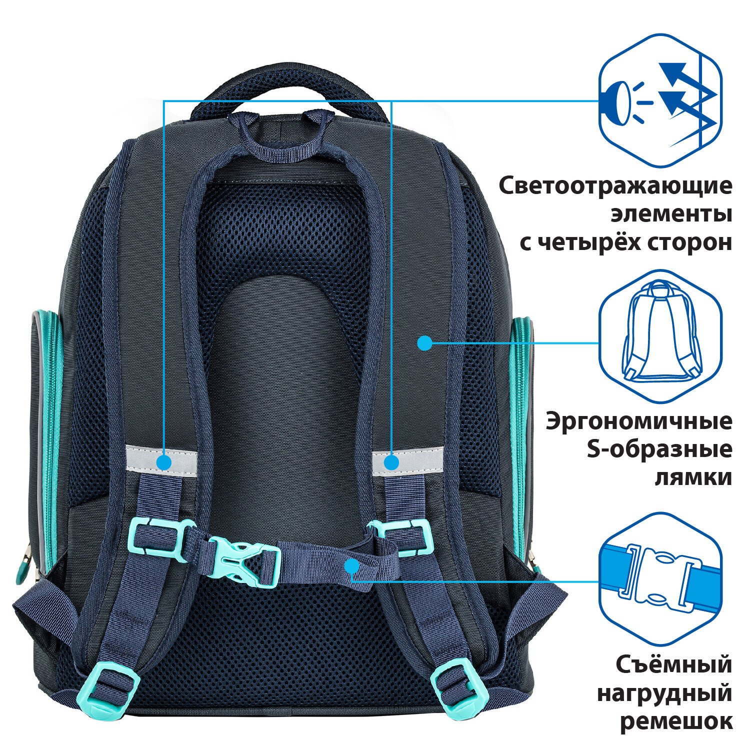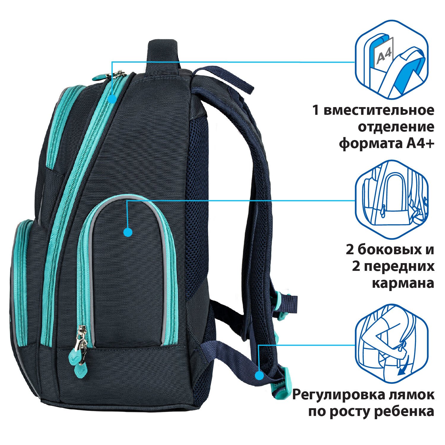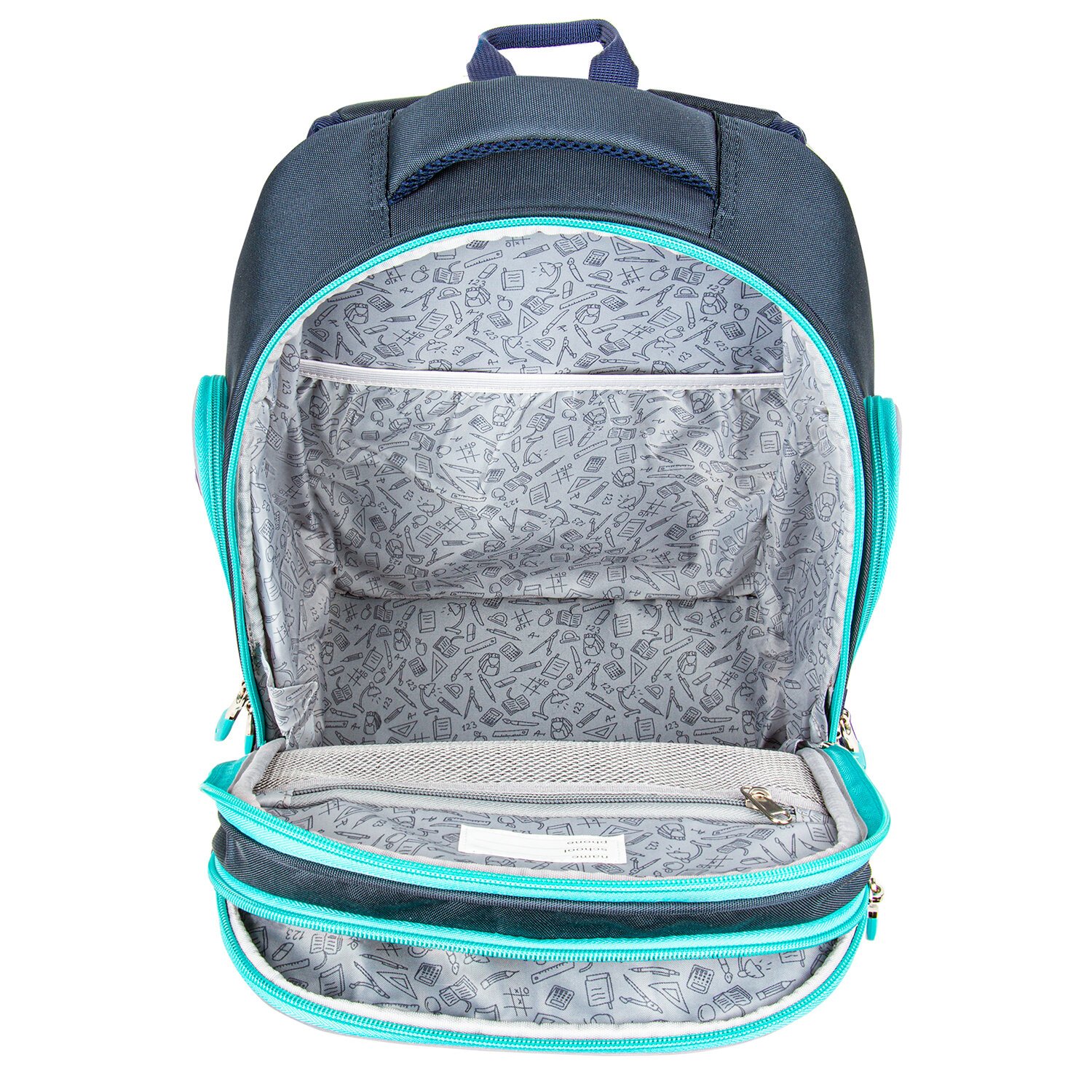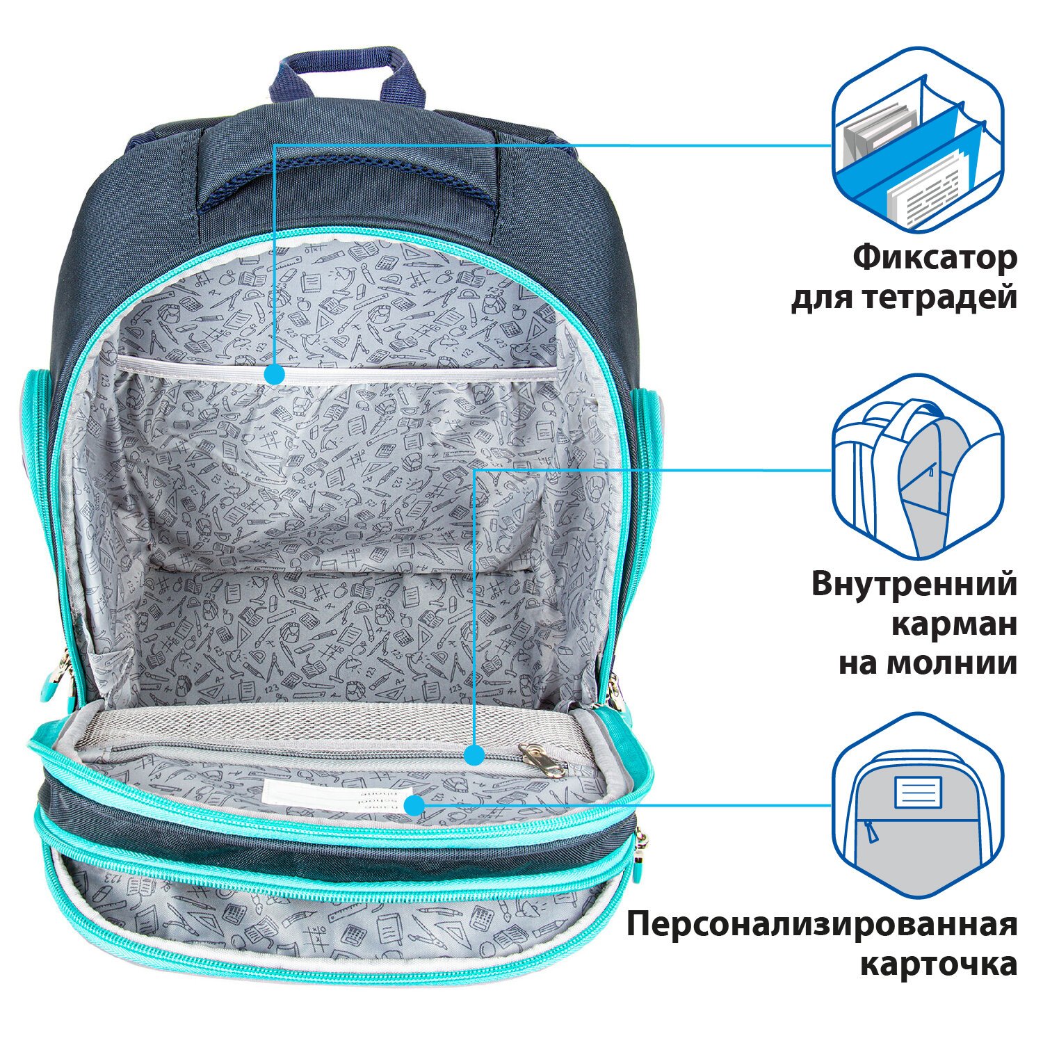 В основном отделении рюкзака можно легко и быстро разместить учебники и тетради формата А4+, а также воспользоваться прижимным отделением на резинке и дополнительным большим карманом-сеткой на молнии. Внутри основного отделения находится именная карточка школьника. Передний нижний карман подойдет для пенала или ланчбокса, а также мелочей, которые можно аккуратно разместить в дополнительных карманах. Передний верхний карман подойдет для различных школьных предметов. Такая организация пространства поможет держать принадлежности в сохранности и приучить ребенка к порядку.