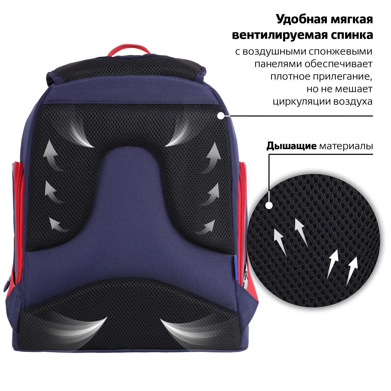 В основном отделении рюкзака можно легко и быстро разместить учебники и тетради формата А4+, а также воспользоваться прижимным отделением на резинке и дополнительным большим карманом-сеткой на молнии. Внутри основного отделения находится именная карточка школьника. Передний нижний карман подойдет для пенала или ланчбокса, или мелочей, которые можно аккуратно разместить в дополнительных карманах. Передний верхний карман подойдет для различных школьных мелочей. Такая организация пространства поможет держать принадлежности в сохранности и приучить ребенка к порядку.