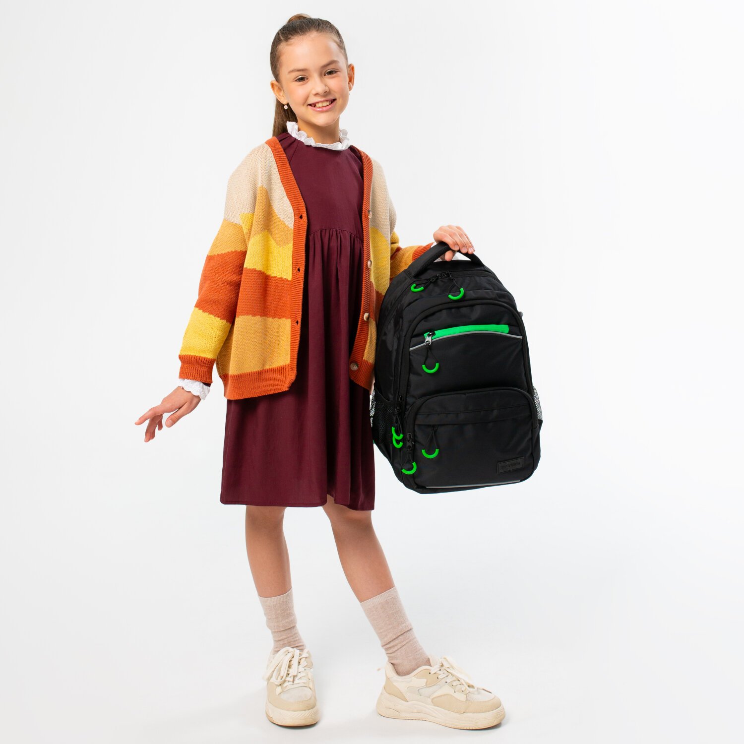 В основном отделении рюкзака можно легко и быстро разместить учебники и тетради формата А4+, а также воспользоваться прижимным отделением и дополнительным карманом на молнии. Также в основном отделении находится именная карточка школьника. Большое переднее отделение на молнии вмещает тетради и учебники формата А4. Внутри переднего отделения находится съемный карабин для ключей, отделение из сетки и карман для телефона. Три дополнительных кармана на молнии подойдут для хранения мелочей. Такая организация пространства поможет держать принадлежности в сохранности.