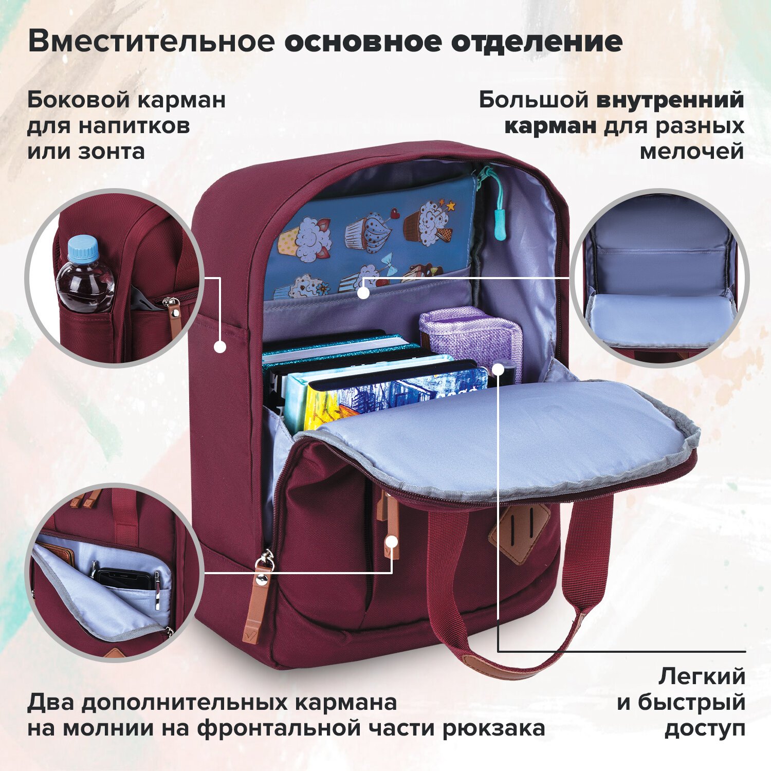 Рюкзак BRAUBERG FRIENDLY универсальный с длинными ручками, бордовый, 37х26х13 см, 270090