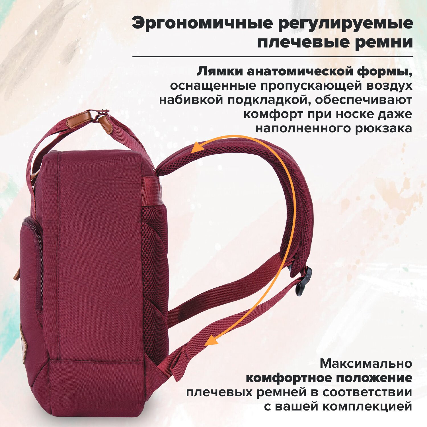 Эргономичные регулируемые плечевые ремни анатомической формы, оснащенные пропускающей воздух набивной подкладкой, обеспечивают максимальный комфорт при ношении рюкзака. Длина лямок – 40 см, максимальная длина регулируемой части – 55 см.