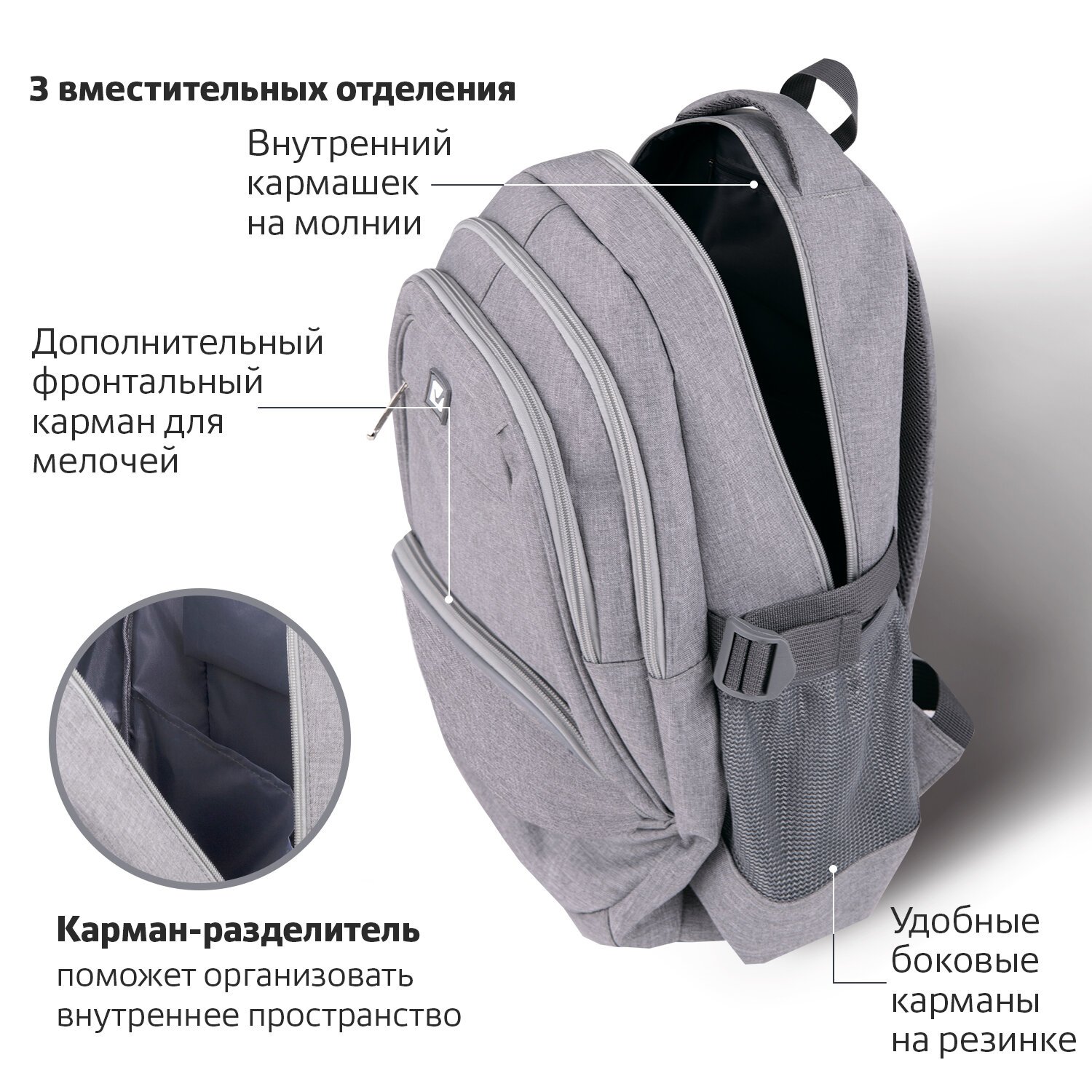 Удобный и надежный рюкзак BRAUBERG имеет оптимальную функциональную организацию - три вместительных отделения, боковые карманы и наружный карман для быстрого доступа к необходимым вещам.