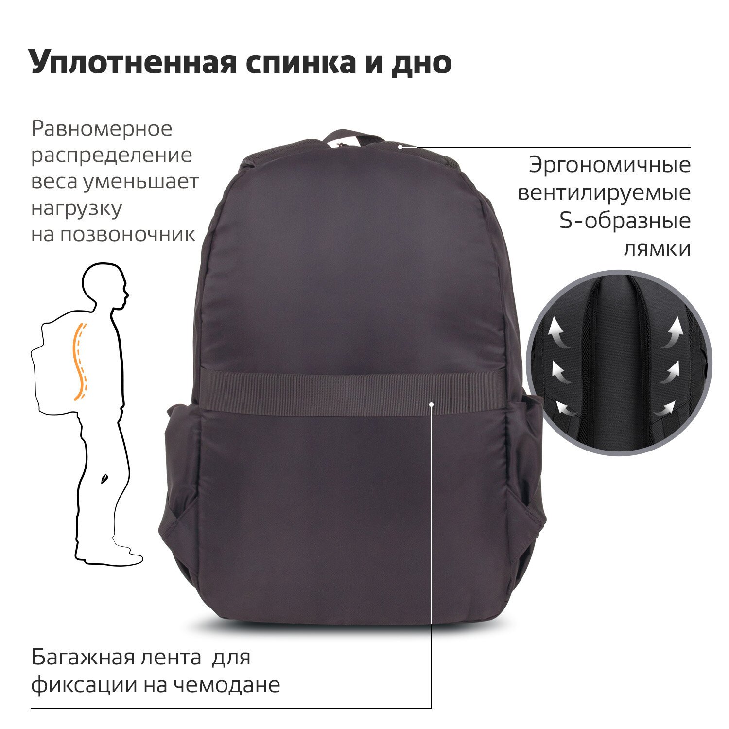 Багажная лента позволяет зафиксировать рюкзак на телескопической ручке чемодана для удобного перемещения нескольких предметов багажа.